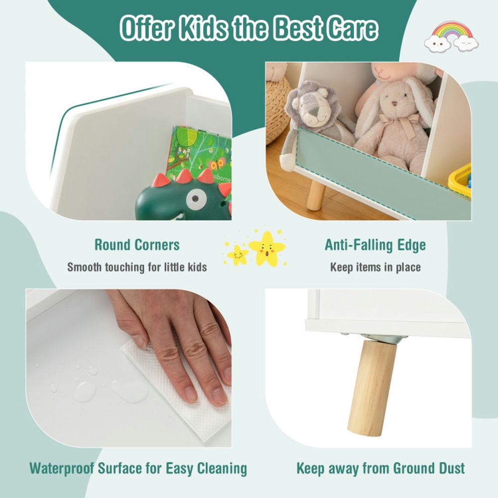 - Safe Wooden Frame: Made of sturdy and well polished MDF, the kids bookshelf features very smooth surface and rounded corners to protect children. More, supported by 4 solid wood legs, it is 4" above the floor, simplifying sweeping and keeping itself away from dust.