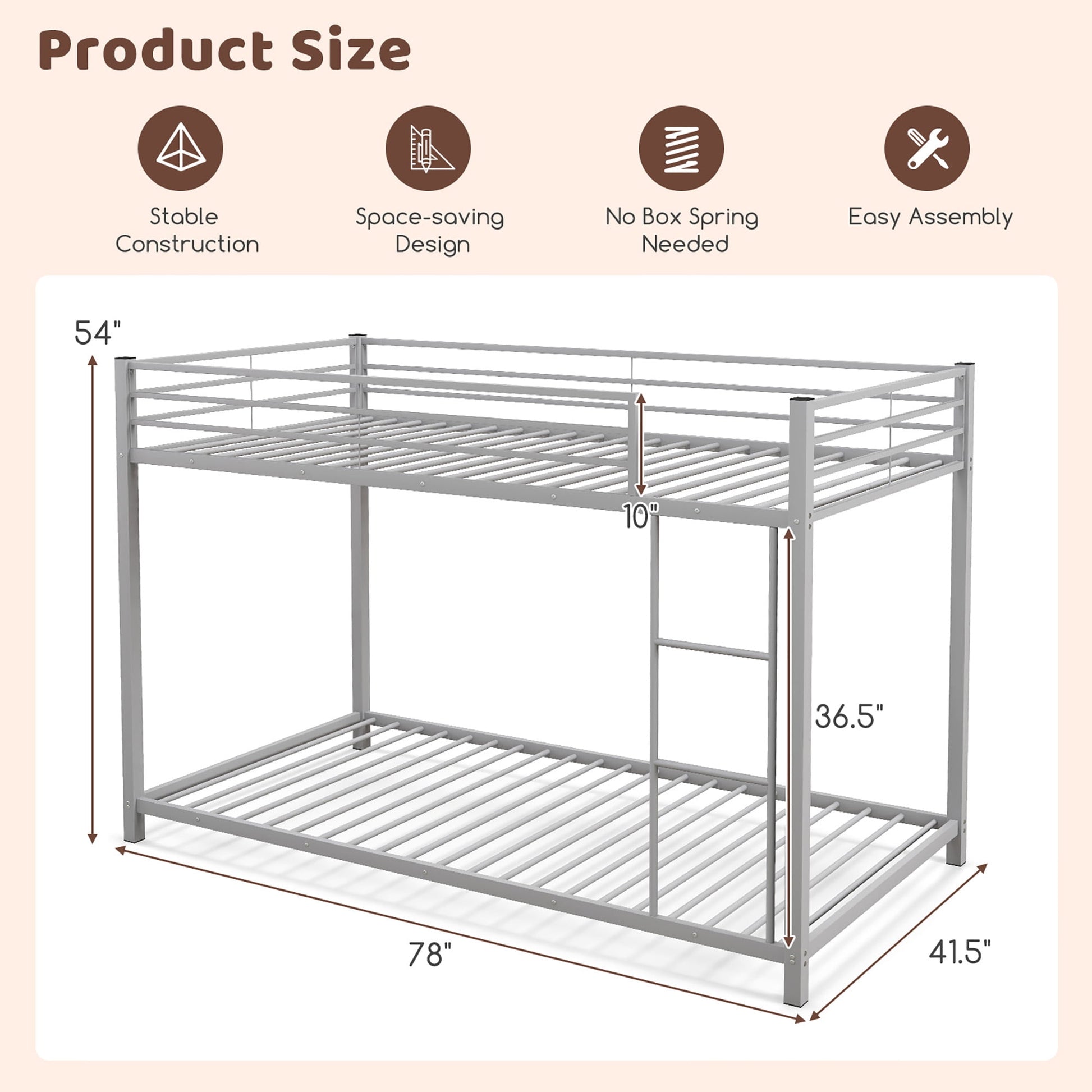 This bunk bed is designed to give kids a safe & convenient sleep experience. Made of powder-coated metal slats, the bunk bed ensures a durable and stable construction for long-term use. The slatted floor bed frame not only provides excellent support, but also eliminates the need for a box spring. Moreover, the low profile twin over twin design of this bunk bed maximizes the floor space while providing comfortable sleeping arrangements for your kids. Featuring a convenient ladder and full-length guardrails, this bunk bed provides easy access to the top bunk while ensuring safety during sleep. Besides, the twin over twin bunk bed offers a practical and sleek solution for any living space.