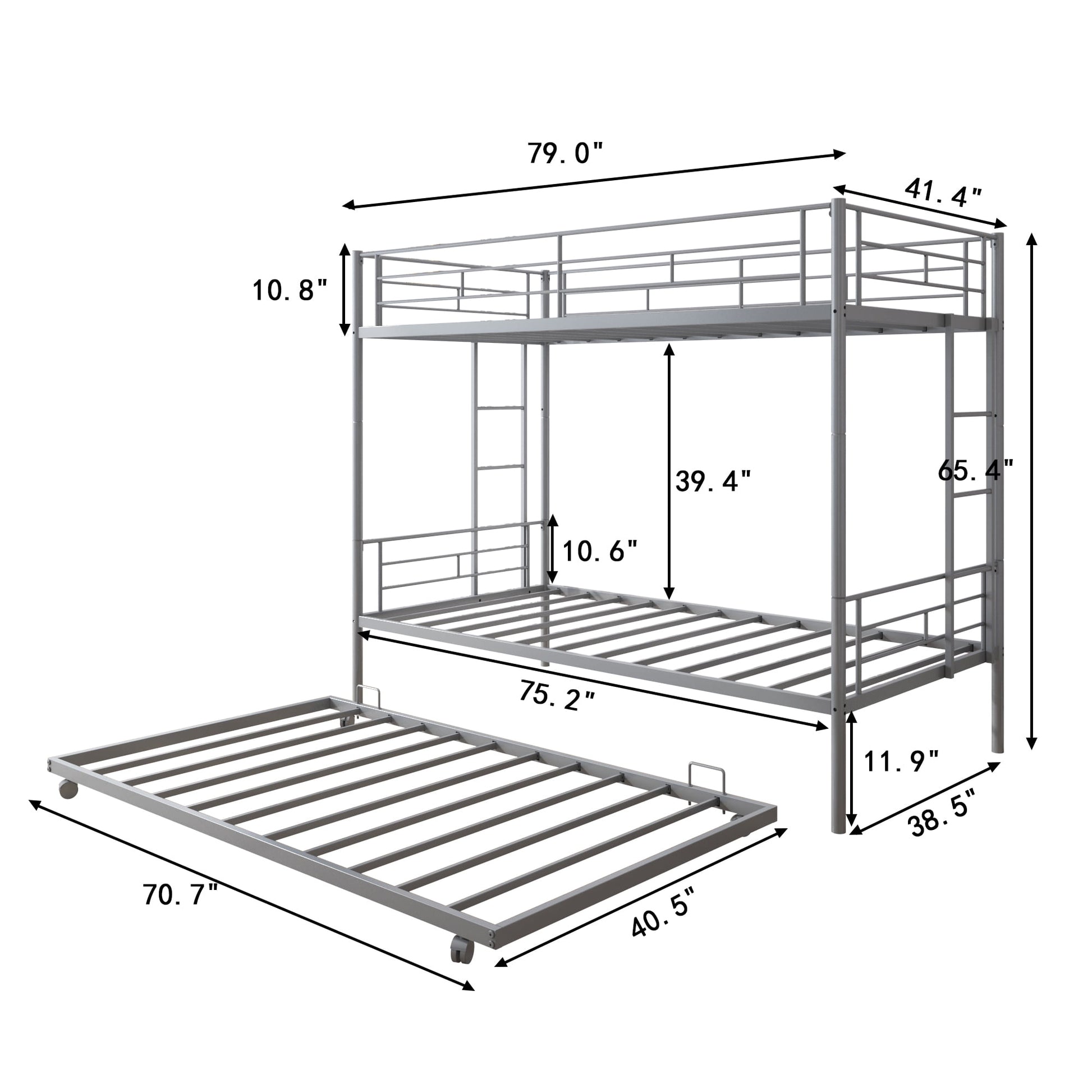 Heavy Duty Kids Twin Over Twin Metal Bunk Bed with Flat Ladder & Safety Guardrail, Convertible Trundle Bed Frame for Dorm, Bedroom, Guest Room, No Box Spring Needed, Silver, D6554