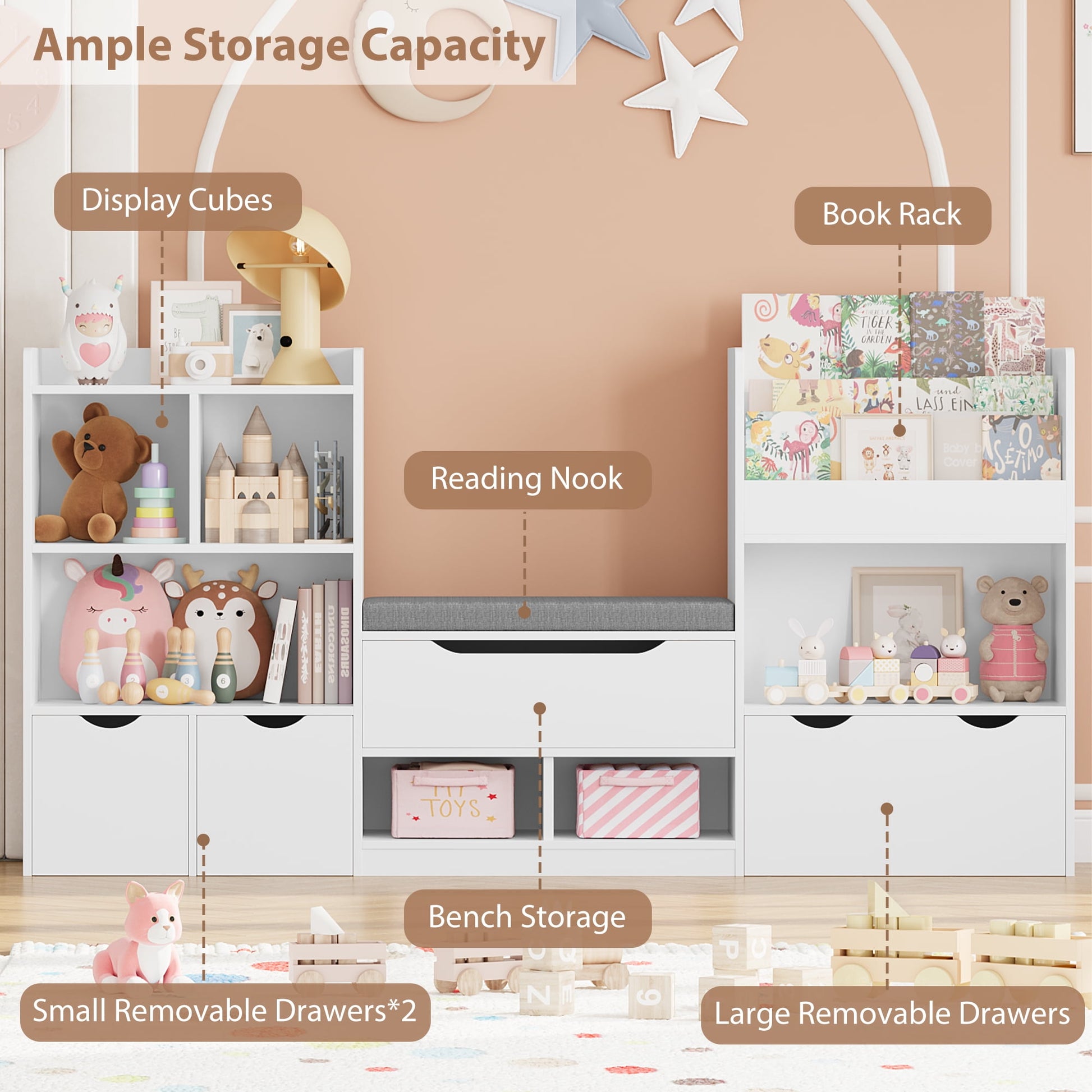 4 Concealed Storage Space:Hiphita Kids bookshelf includes bench under storage and 3 removable drawers where you could store children's seasonal clothing and unused toys.