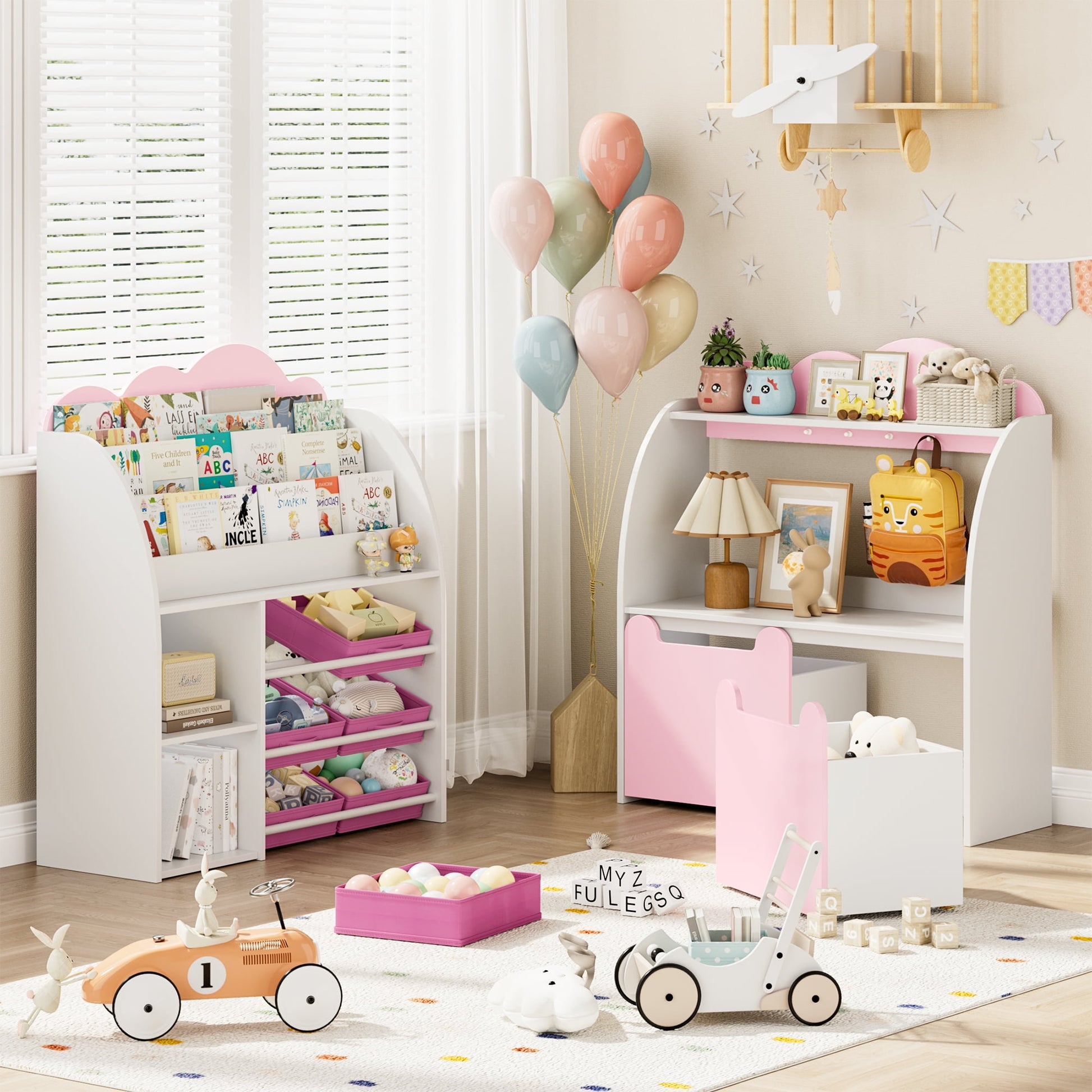 Hiphuta Kid's Toy Storage Organizer, Toddler Bookshelf with 6 Bins & 2 Removable Drawers, Book Rack Storage 3 Tiers, White Pink
