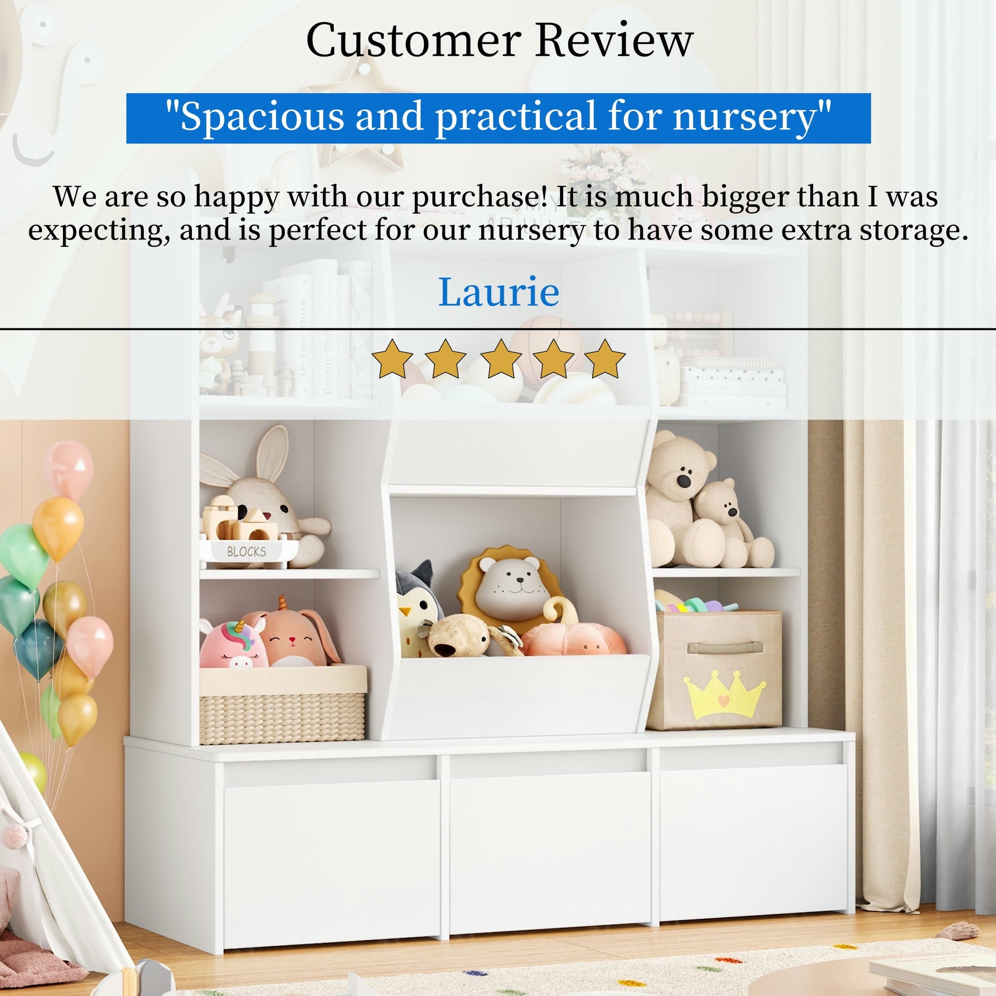 The Hiphuta Kids Bin Storage and Bookcase provides a place for your little ones to keep their toys and books and is a delightful addition to any playroom, family room, den, and more. The bookshelf features eight open storage bins and three removable drawers, creating a great opportunity to teach youngsters how to pick up after themselves and organize their books and belongings. Hiphuta toy storage organizer is easy to assemble and features 360 degree swivel wheels with each drawer and wall attachment strap for added stability. This wood toy organizer designed with a bright white finish, it is suitable for any decorations of children's rooms, playrooms and bedrooms, foyers, and family rooms. The toy box with bookshelf is a perfect catch-all for stuffed animals, comic books, or own clothes. This toddler bookshelf is a perfect gift for birthdays, Christmas, or even a surprise.