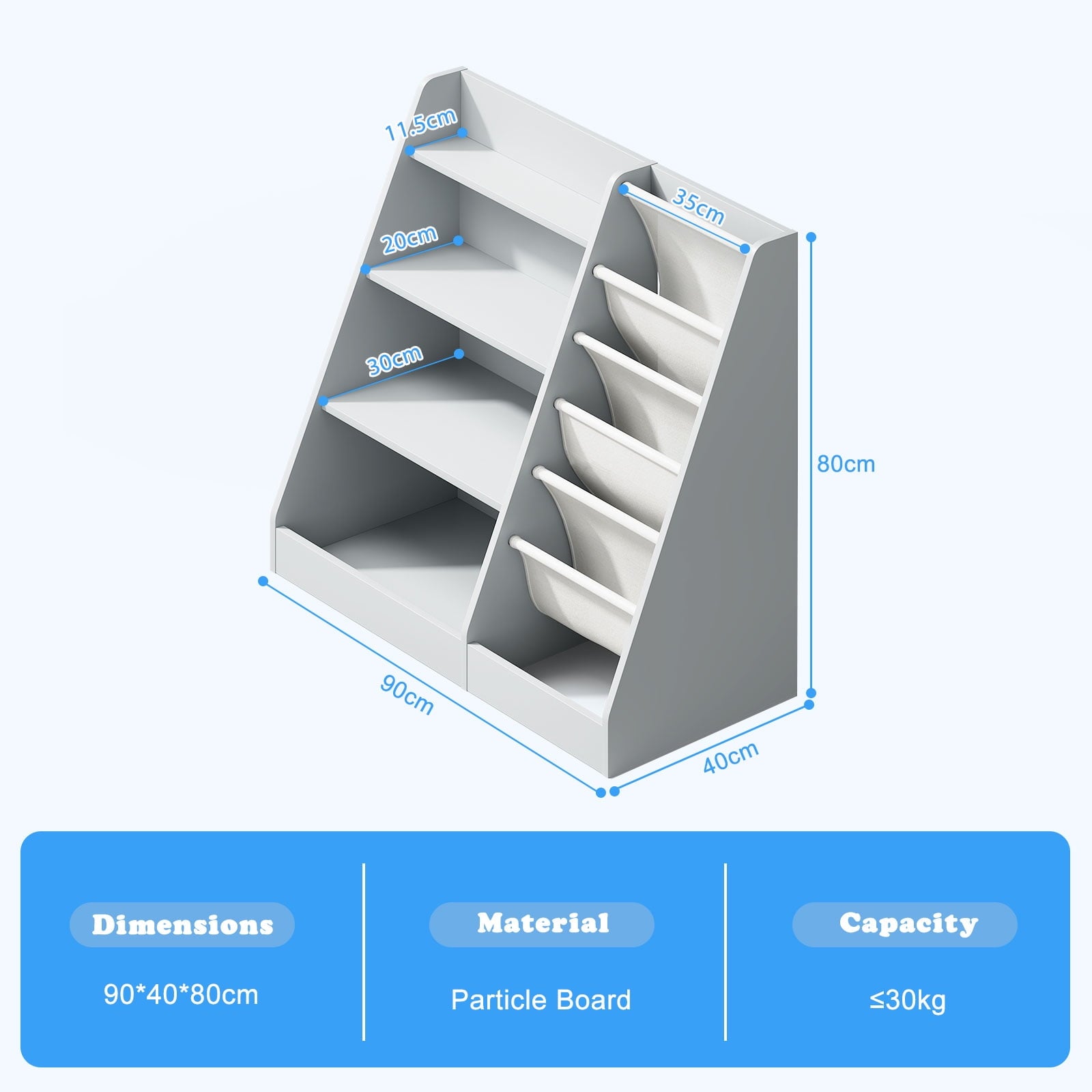 Ample Storage Space: 4 tier wooden bookcase and Five Deep Cotton Linen Storage Sling Pockets can store children's favorite books, notebooks, and toys,It has enough storage space for building blocks, small trucks, plush animals, model cars, dolls, memorabilia, art supplies. Natural Eco-Friendly Material: Our bookshelf organizer for kids is constructed with high quality particle board and cotton linen fabric. Holding heavy book without rip apart. So that your kids keep away from chemical hazard.