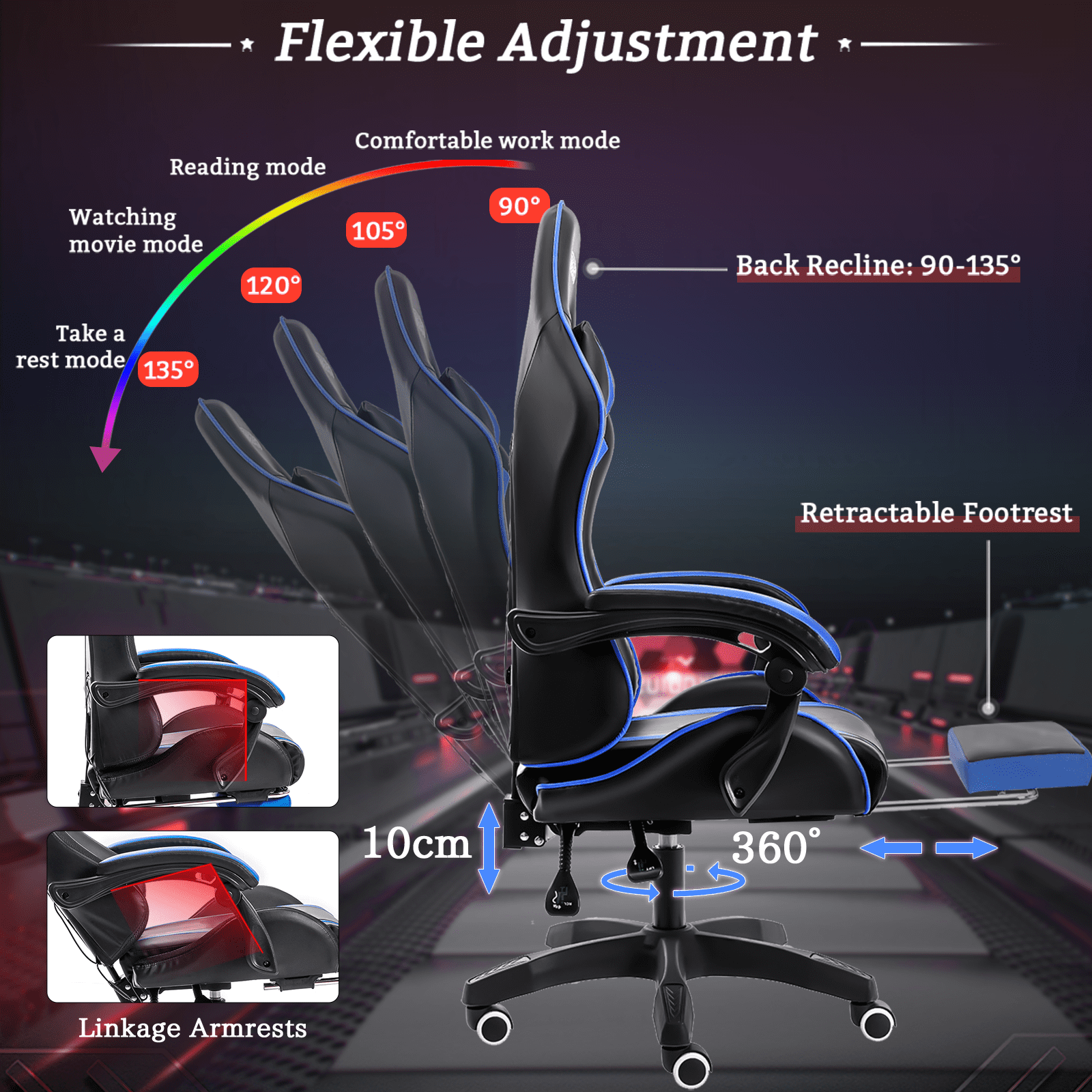 Designed with LED flashing lights on the back and the edge of the seat, you can easily adjust multiple lighting modes and brightness by remote control, creating a more dynamic feel in your gaming room while playing. The massage gaming chair features two motors in the waist cushion position for lumbar massage function, providing you ultimate comfort and relaxation. Strong metal frame designed to help promote a comfortable seated position, keeping you comfy after long hours of game or work. Helps you maintain a neutral, balanced posture and reduce your pressure and pain. The gaming chair is made of Smooth leather which is sturdy and durable! Thick and firm, easy to clean and maintain. The chair seats are made of thickened sponge material which means sitting comfortably for a long time to play games, watch movies, or work. Heavy-duty base and smooth-rolling casters for great stability and mobility. Weight Capacity: 397lbs Linkage armrests move with a 135-degree recline backrest, making the chair more flexible; Class 3 gas lift cylinder for 10cm height adjustment and 360-degree swivel seat. Well-padded seats, lumbar & headrest cushions make extended gaming sessions more enjoyable. The extra bonus footrest design allows you to enjoy a high-quality nap anytime anywhere, and immediately restore energy.PACKAGE LIST: