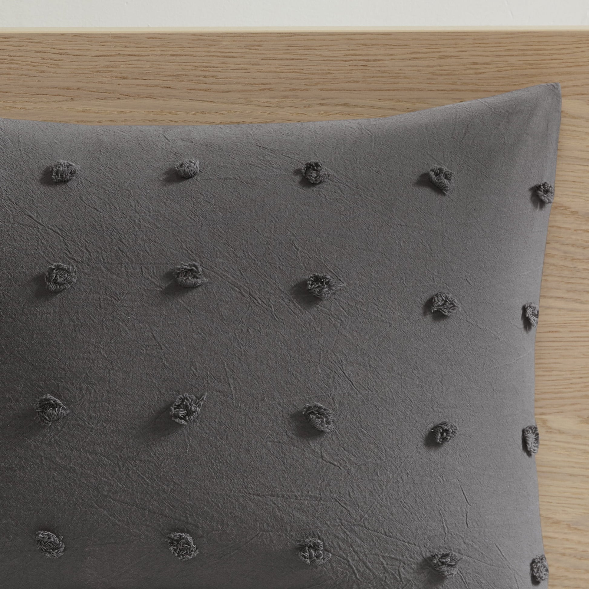 The Home Essence Apartment Cotton Jacquard Grey 5-Piece Comforter Set brings a soft and charming update to your bedroom. The cotton comforter features small tufted chenille dots that create a fresh shabby chic look. Matching shams (1 in Twin/TwinXL) and quilted Euro shams (1 in Twin/TwinXL) complement the cotton jacquard comforter set. Two decorative pillows are also included, adding the finishing touches. This bedding set is also OEKO-TEX certified, meaning it does not contain any harmful substances or chemicals to ensure quality comfort and wellness