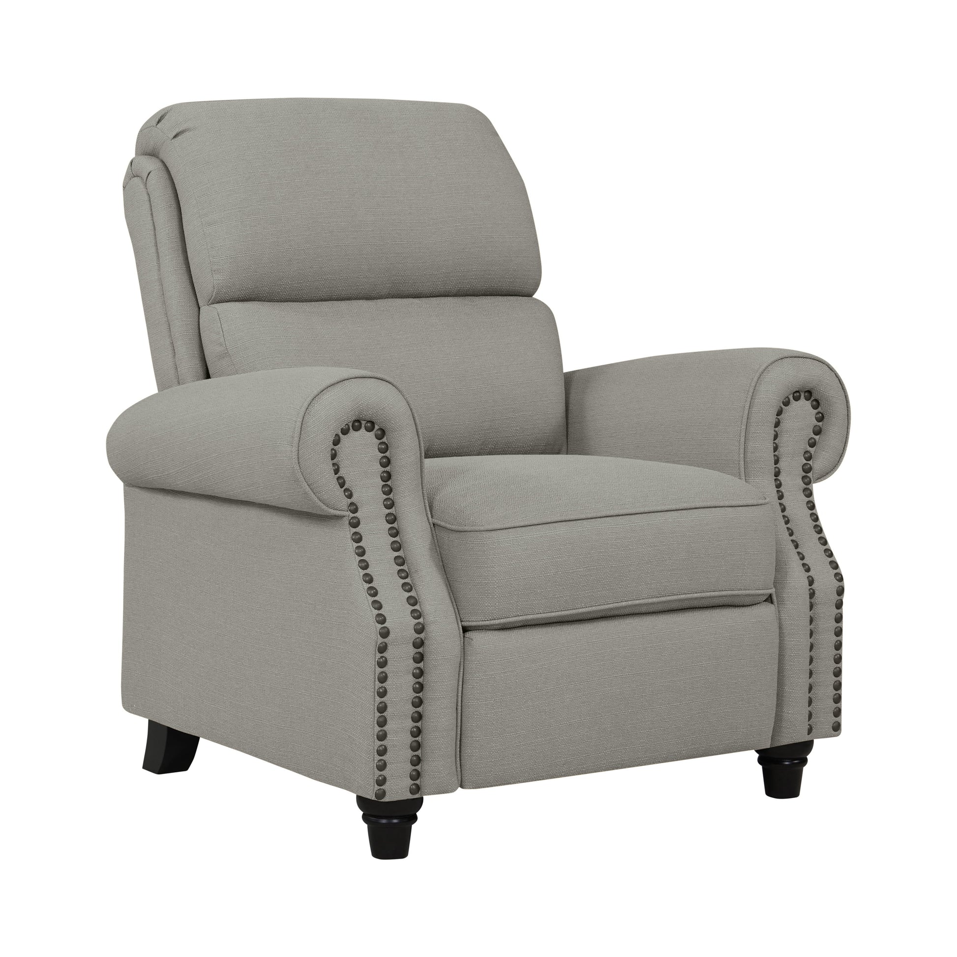 Sit back and relax in this Homesvale traditional push back recliner chair with rounded arms. It features hand-tacked antique bronze nail heads. It is covered in a durable, easy clean medium dove gray linen-like 100% polyester fabric. You can simply push back to recline, no levers or buttons are required. This traditional style offers a very generous seat size for comfort. With its comfortable seat and arm support, this recliner is perfect for long-term sitting, TV viewing and a relaxed recline in a living room, bedroom, den or media room.