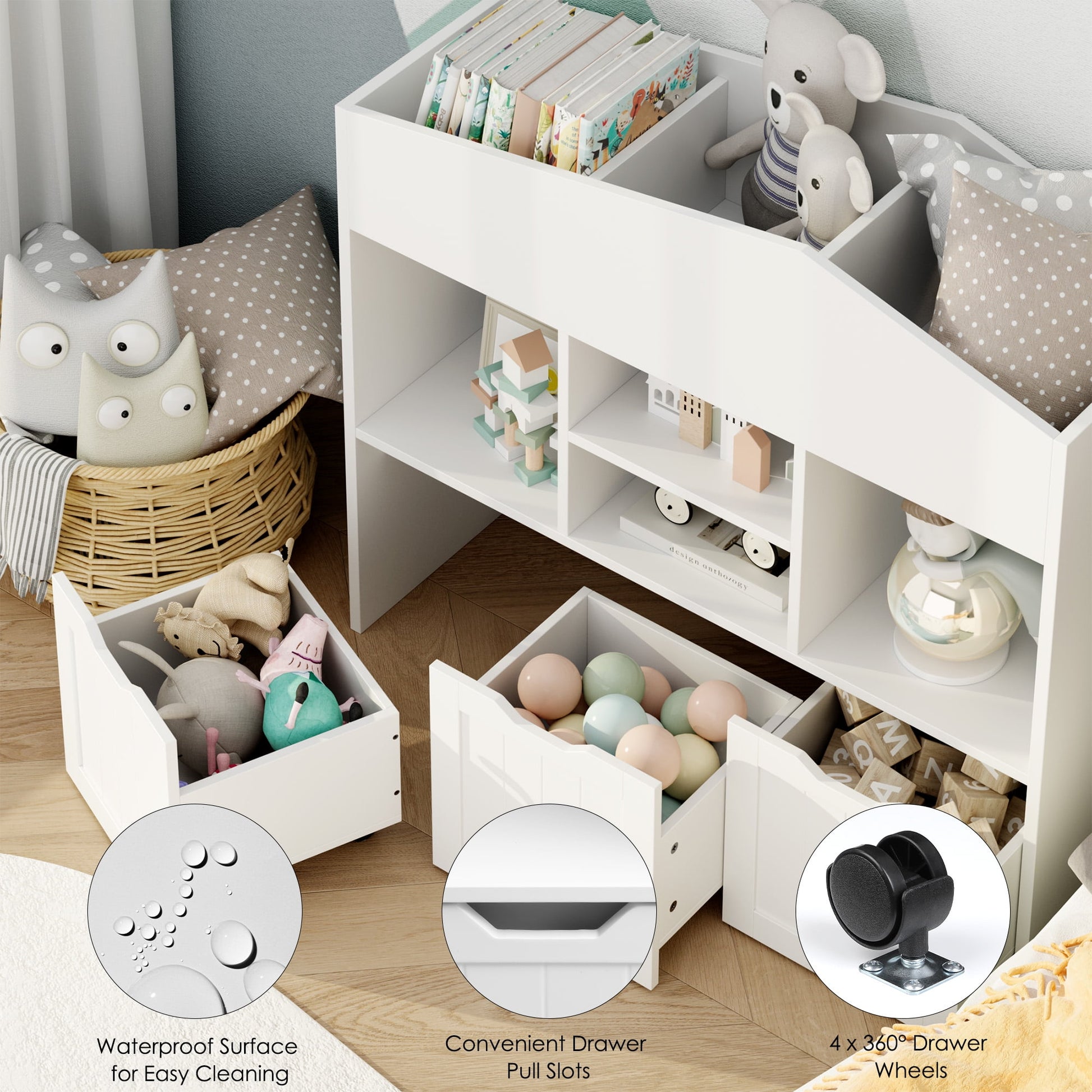 This kids storage organizer cabinet is a combination of a bookcase and a toy cabinet design, which has 4 storage compartments, 3 bookshelves and 3 movable drawers. Bookcase with 3 large storage drawers on wheels, easy to move around and convenient to store or remove toys and books. Our toy storage organizer is made of high quality MDF board with strong load capacity. Smooth surface, waterproof and easy to clean. The toy storage organizer is equipped with metal anti-tip anchors, which can be used for a long time. This toy organizer not only helps your child store toys and books easily, but also improves their organizational skills and reading habits. The kids bookcase comes with the help of all mounting hardware and detailed instructions, it can be easily assembled by an adult in less than 40 minutes. We provide quality customer support, if you have any questions, please email us and we will reply within 24 hours.