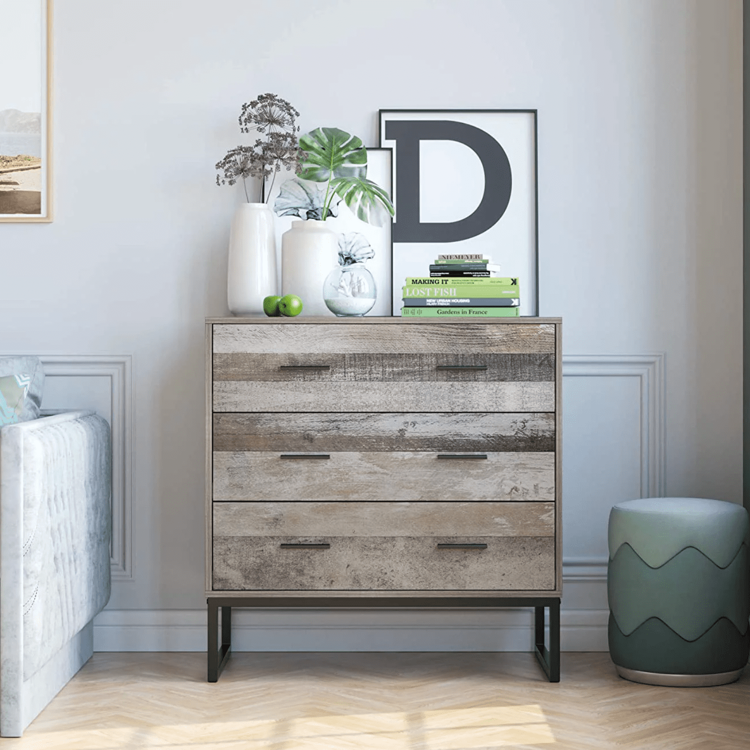 Featuring a natural faux oak grain finish, the Homfa 3 drawer dresser cabinet blends modern and stylish industrial elements with natural living tones to create a practical storage solution.