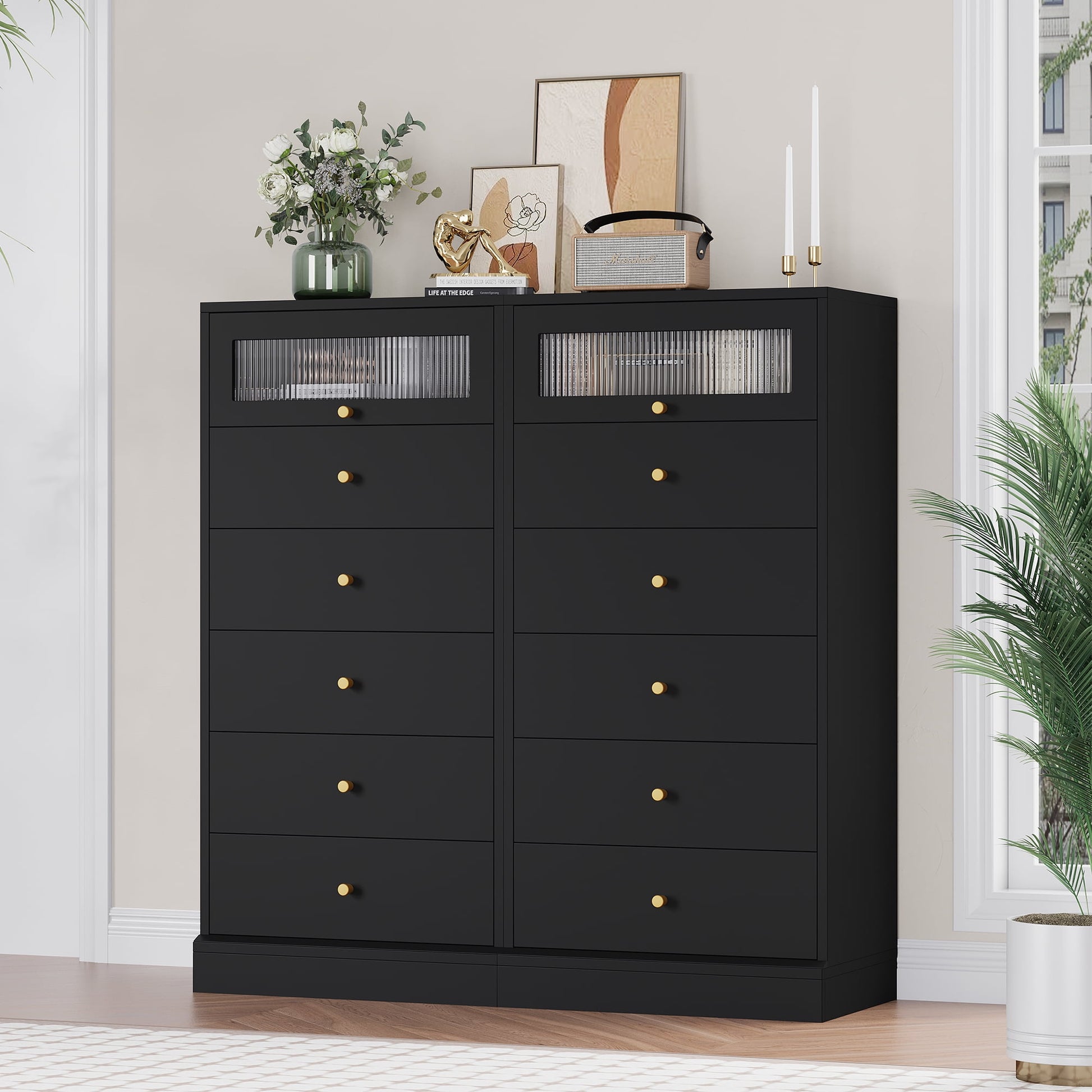 This black dresser for bedroom has 6 large drawers that slide out easily. The chest of drawers's top hutch has a glass doors with a swivel opening and closing design that looks like a pendulum from the side, making every access easier and more fun. Keep your lamp and laptop on top, store your daily items in the drawers - this black gold small dresser gives you tons of vertical storage space for anywhere in your bedroom, living room, hallway. Supported by a stable base and extra anti-tip straps, your children can play the tall dresser with confidence.