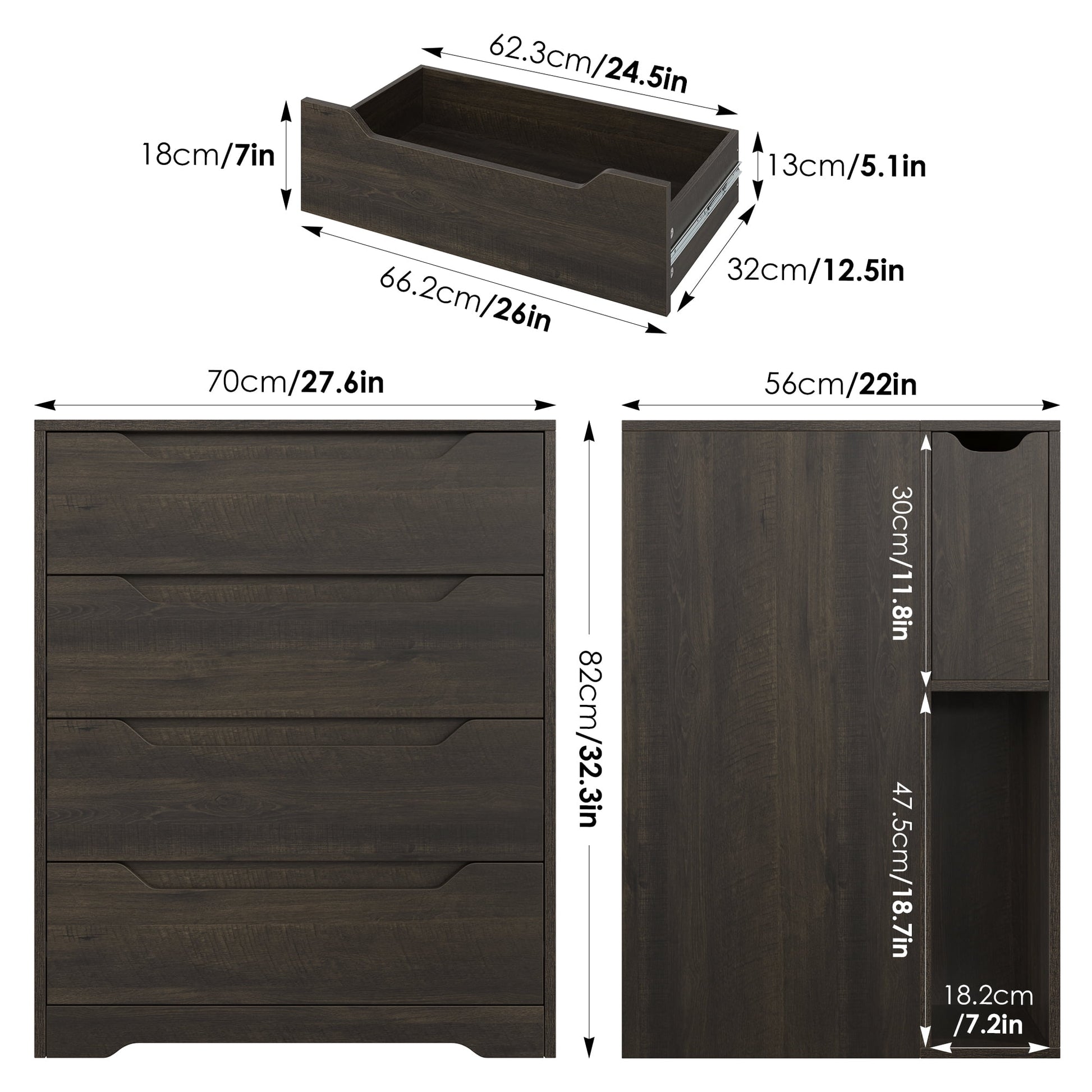 Specification: Material: Particleboard Color: Dark Brown Overall size: 70*56*82cm/27.6''*22''*32.3'' Drawer size: 66.2*32*18cm/26.1''*12.6''*7.1'' Number of drawers: 4 Assembly Required: Yes