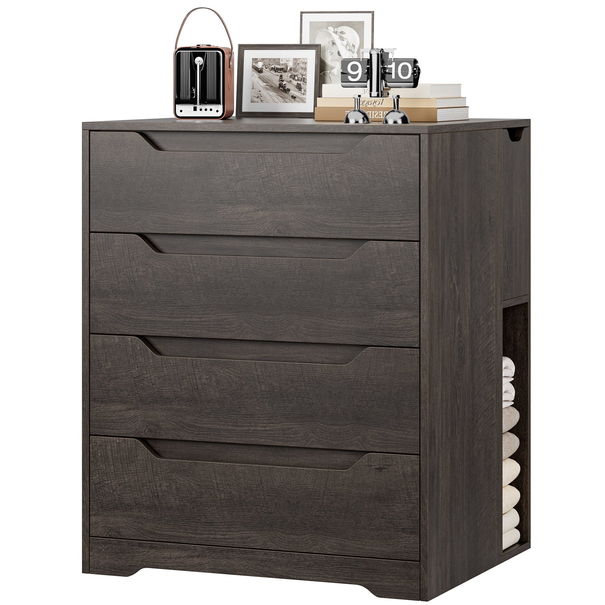 Designed with elegant cutout pulls, decorative beveled base and fluted knobs, this modern 4 drawers dresser adds clean and spacious decorative flair to your bedroom, living room, hallway and other spaces!