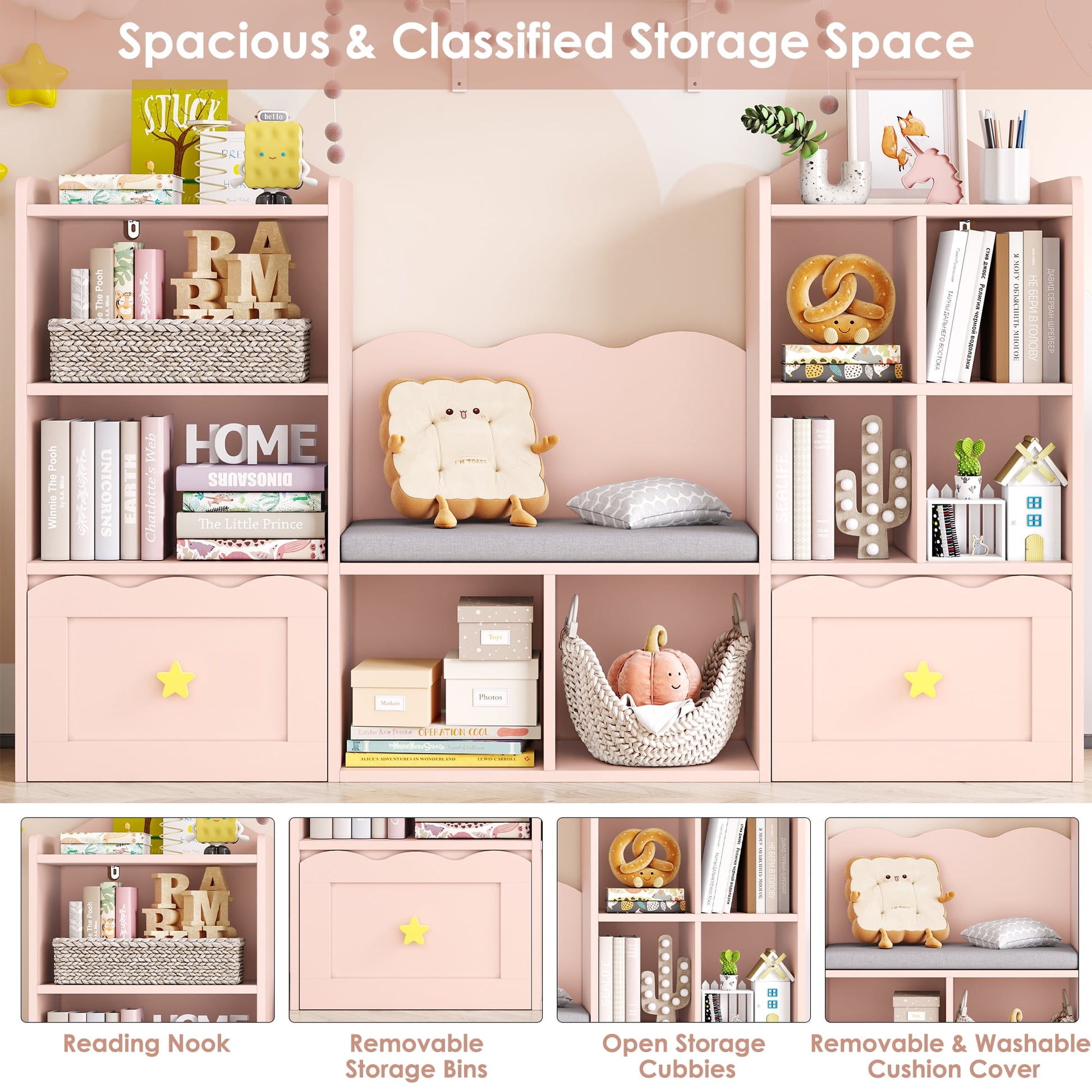Homfa Kids Bookshelf with Reading Nook, Kids Storage Cabinet with 8 Cubby, 2 Wood Toy Bin for Nursery Kids Room, Pink