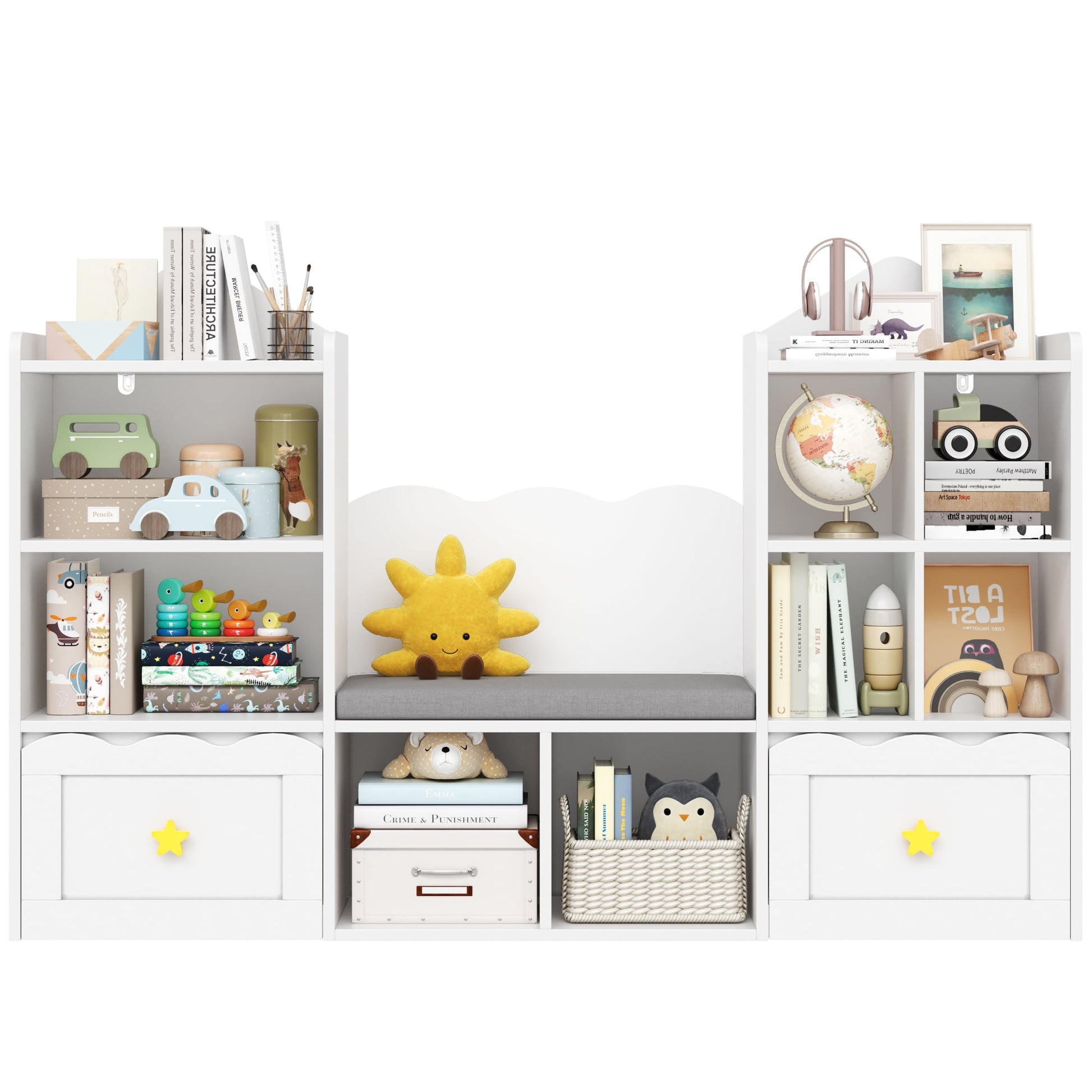 Homfa Kids Bookshelf with Reading Nook, Kids Storage Cabinet with 8 Cubby, 2 Wood Toy Bin for Nursery Kids Room, White