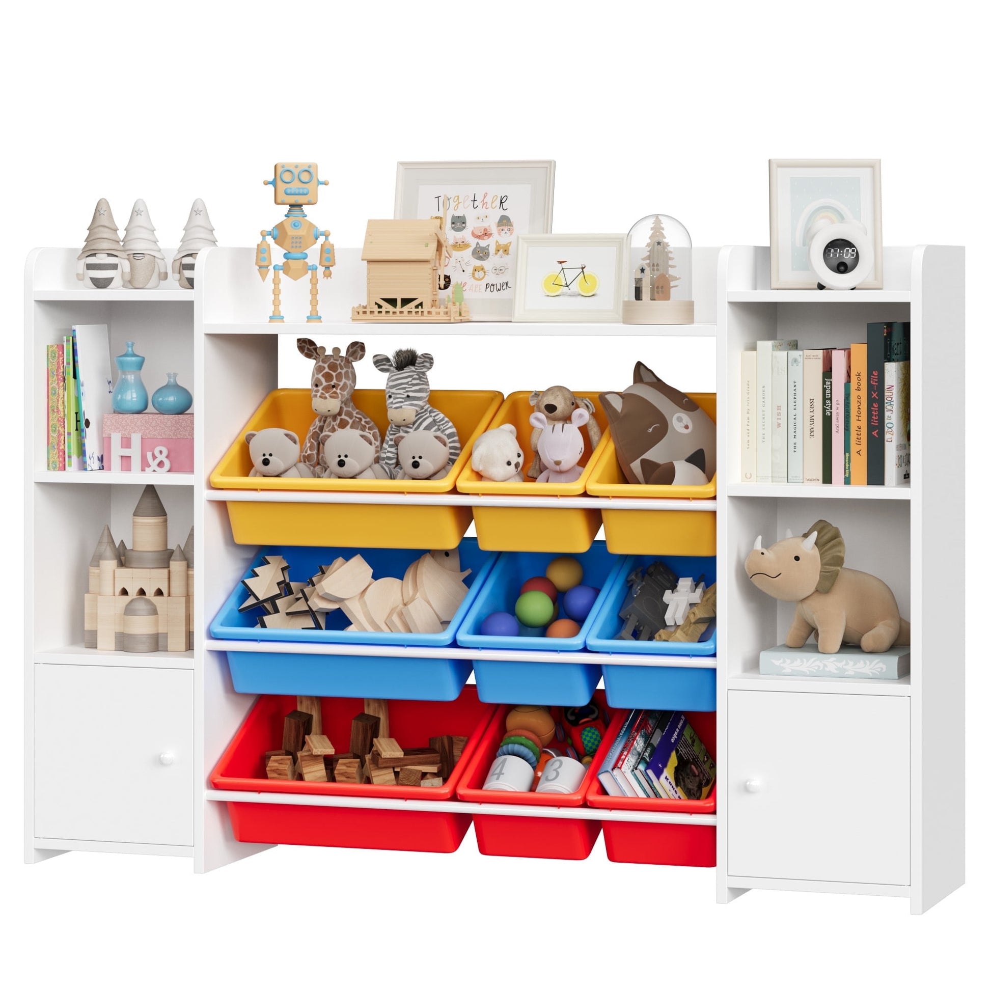 - The combination of open bookshelves and closed door storage cabinets, with 9 colorful kids toy cubby bins in two sizes, easily meets the daily toys and books storage and stimulates children's creativity.