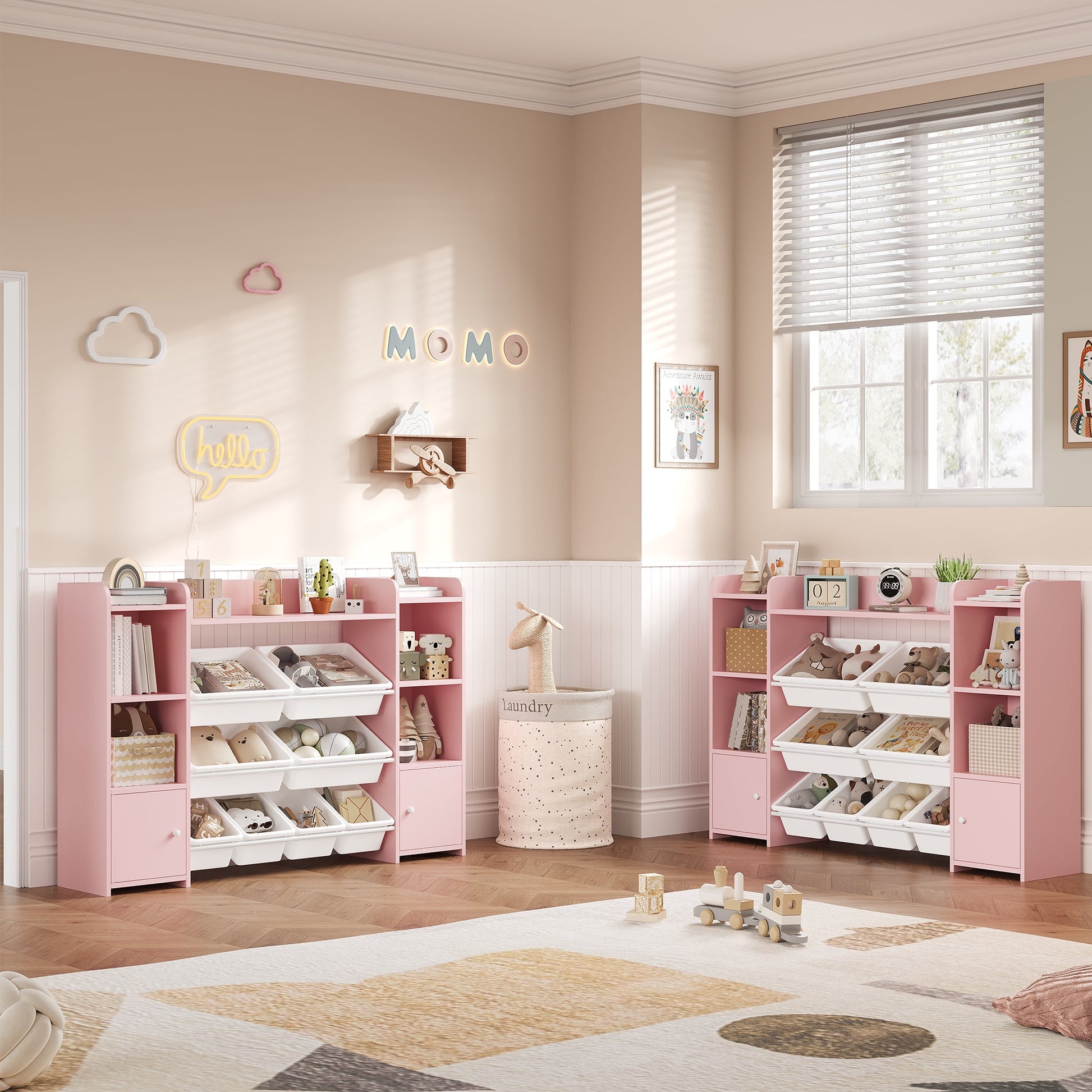 - The combination of open bookshelves and closed door storage cabinets, with 8 pink kids toy cubby bins in two sizes, easily meets the daily toys and books storage and stimulates children's creativity.