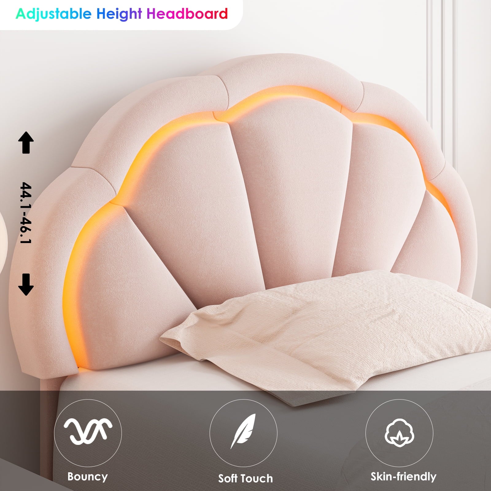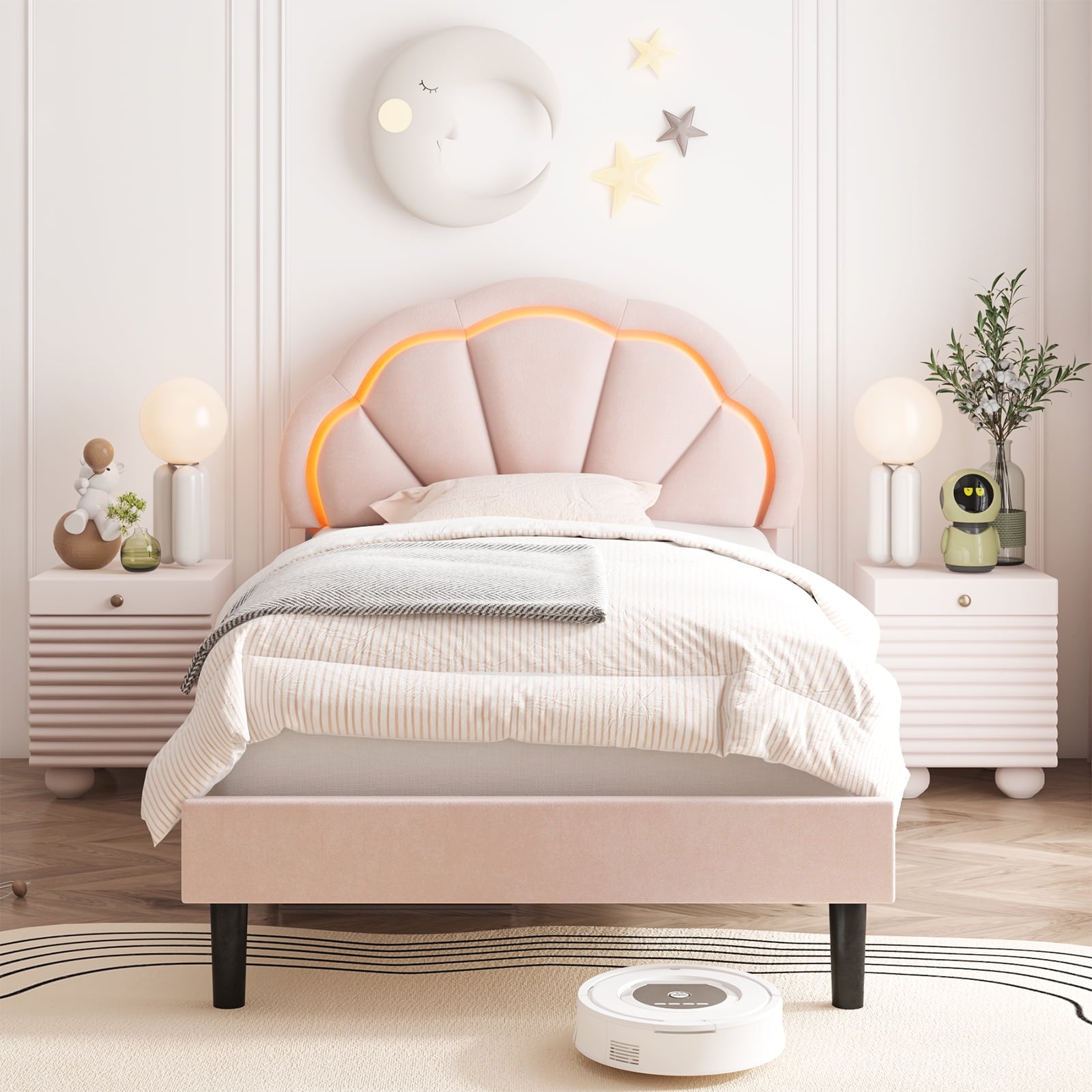 Homfa LED Bed Frame, Twin Size Velvet Upholstered Platform Bed with Adjustable Headboard, Lights Seashell Bed for Kids Girls, Pink