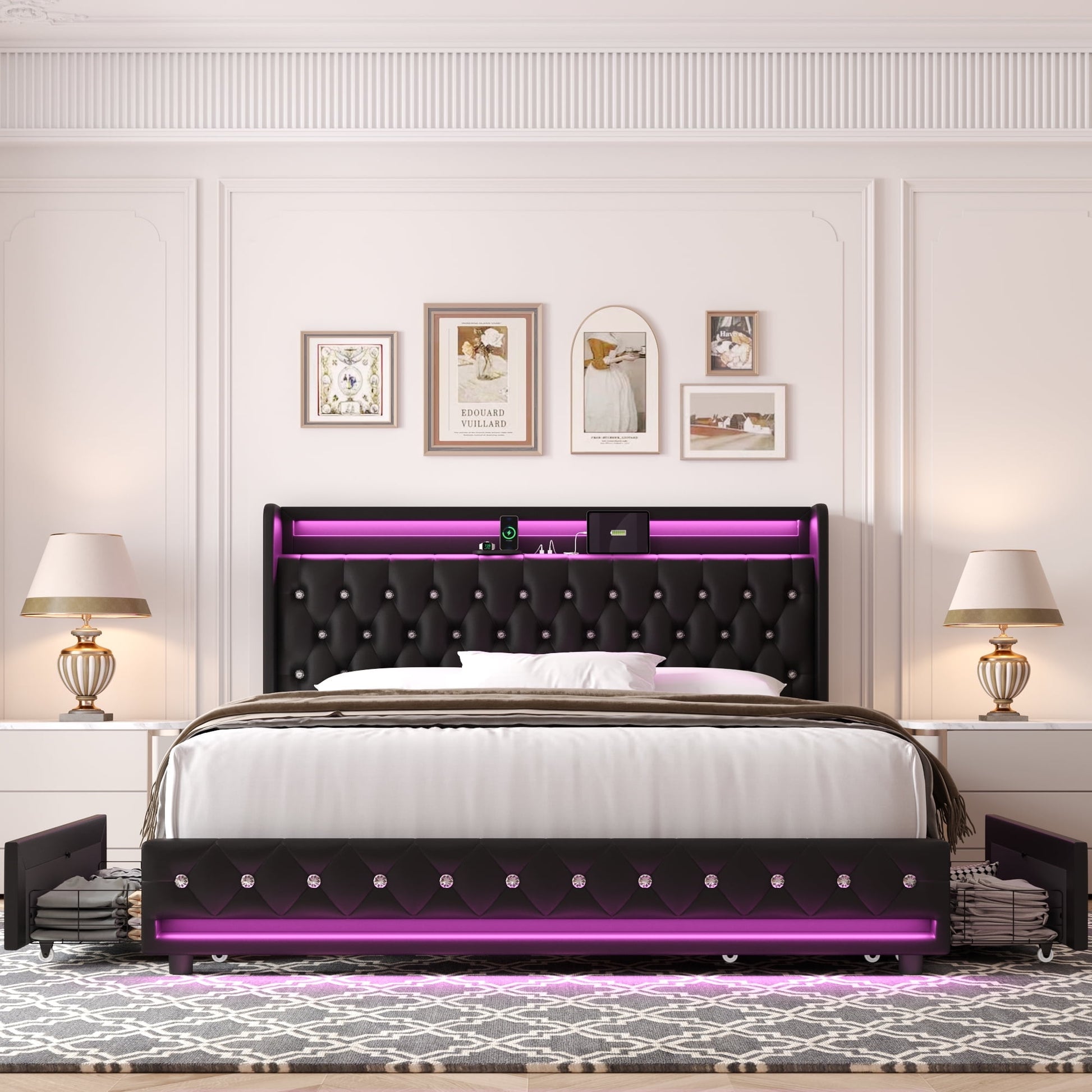 Homfa Queen Size LED Bed Frame with 4 Storage Drawers, Modern Wingback PU Leather Crystal Button Upholstered Platform Bed Frame with Outlets and USB Ports & Display Platform, Black