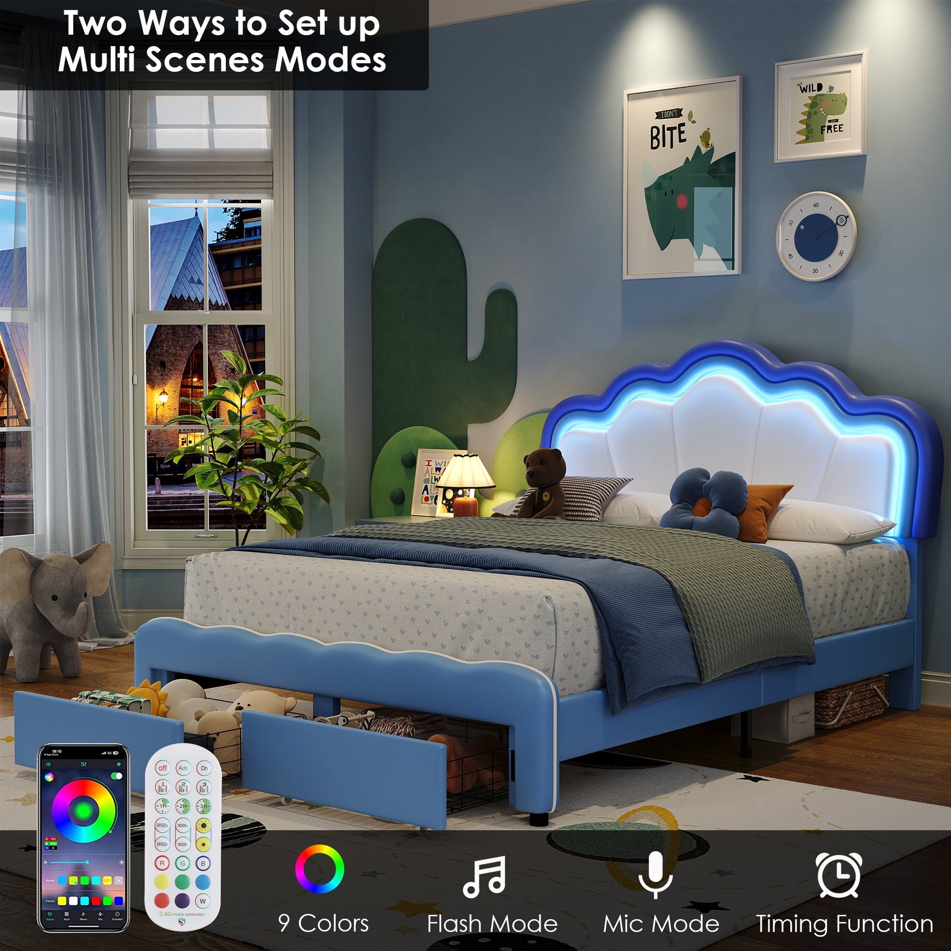 The headboard is equipped with LED light strips with 9 colors, which make the bed frame colorful and create a fascinating atmosphere and stimulate the child's sense of color and imagination. In addition, an underbed storage drawer provides additional storage space in the bedroom. This lovely LED bed frame is definitely the best bedroom gift for your kid!