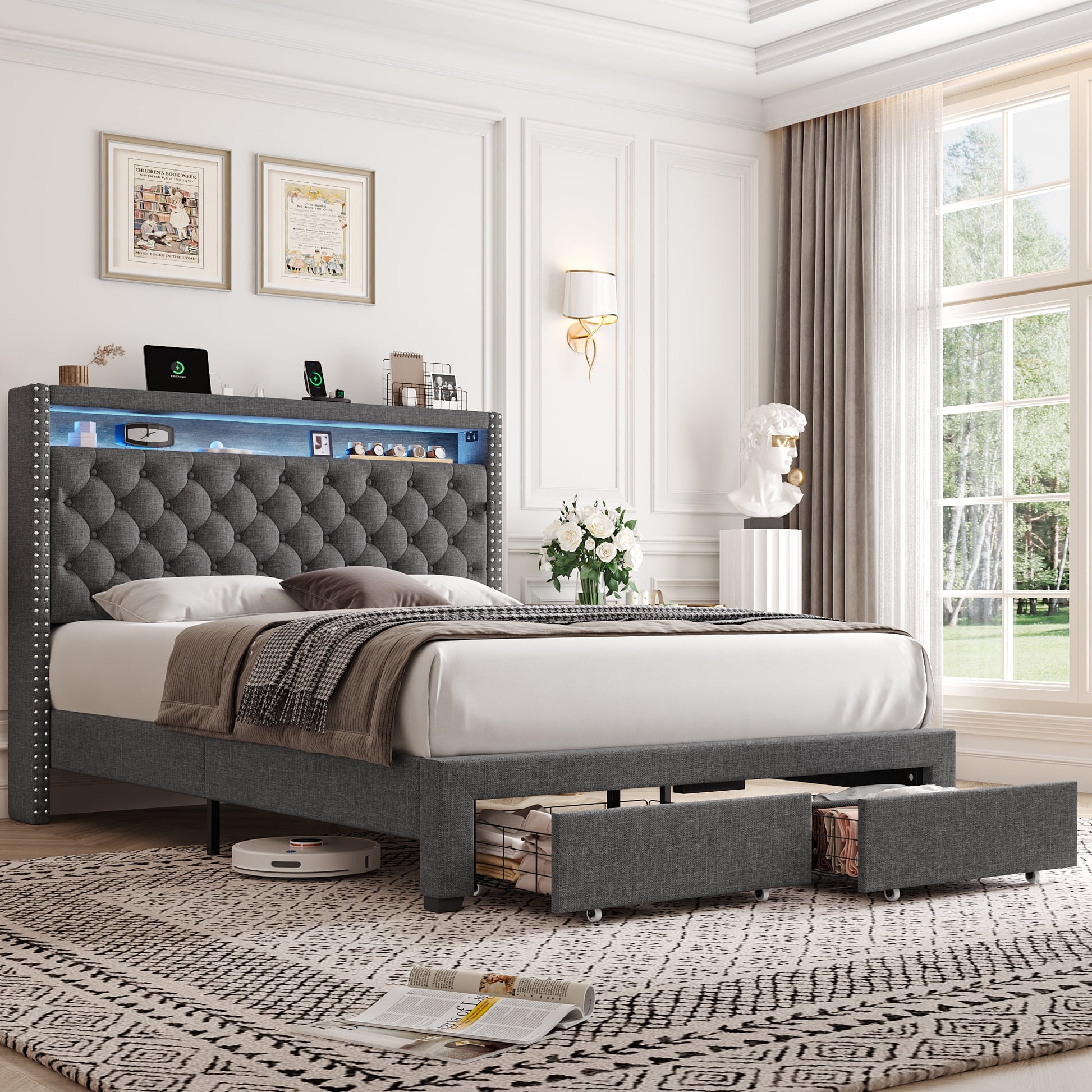 Homfa Queen Size LED Bed Frame with Outlets and USB Ports, Modern Storage Platform Bed with Linen Fabric Button Tufted Upholstered Headboard, Gray