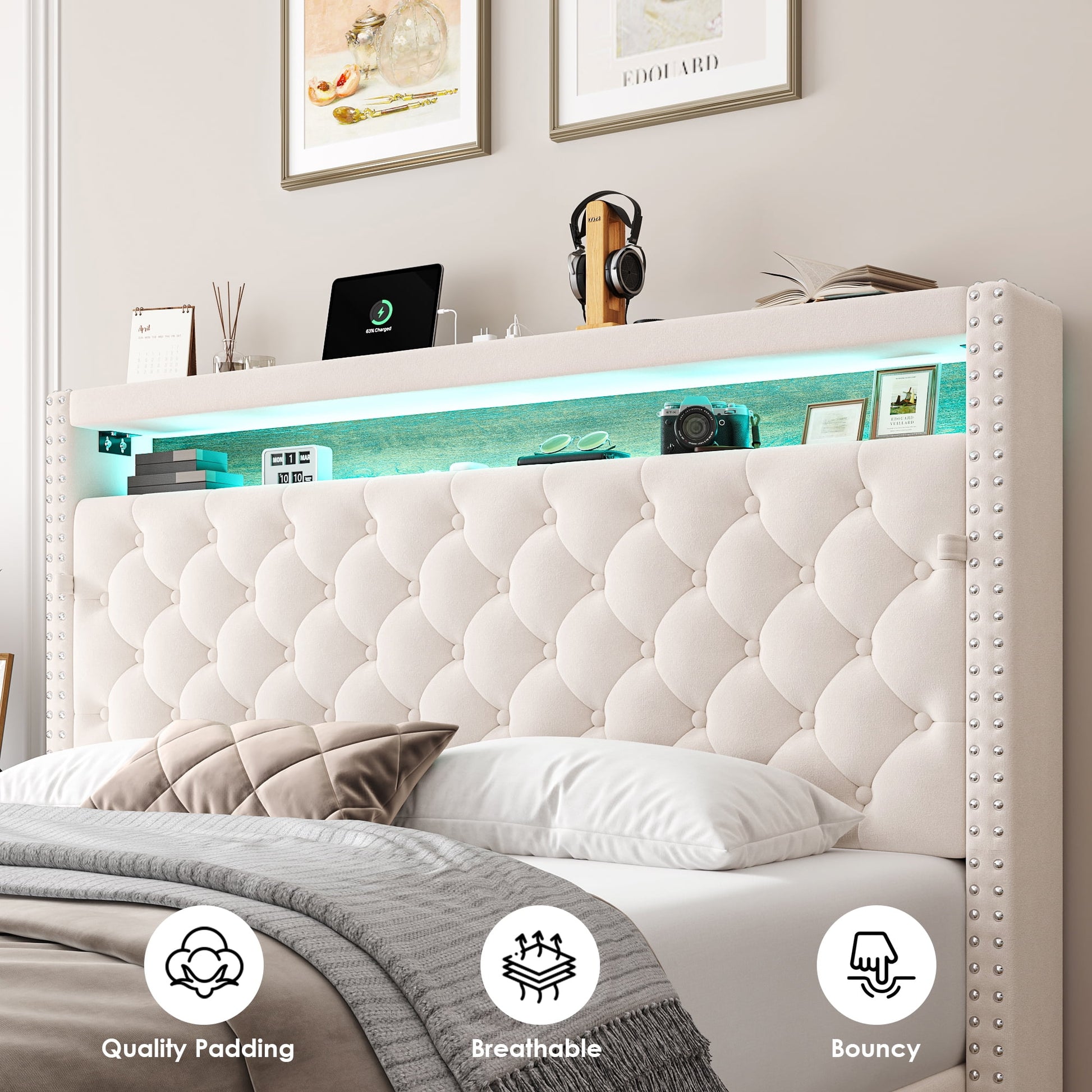 Homfa Queen Size LED Bed Frame with Outlets and USB Ports, Modern Storage Platform Bed with Velvet Fabric Button Tufted Upholstered Headboard, Beige