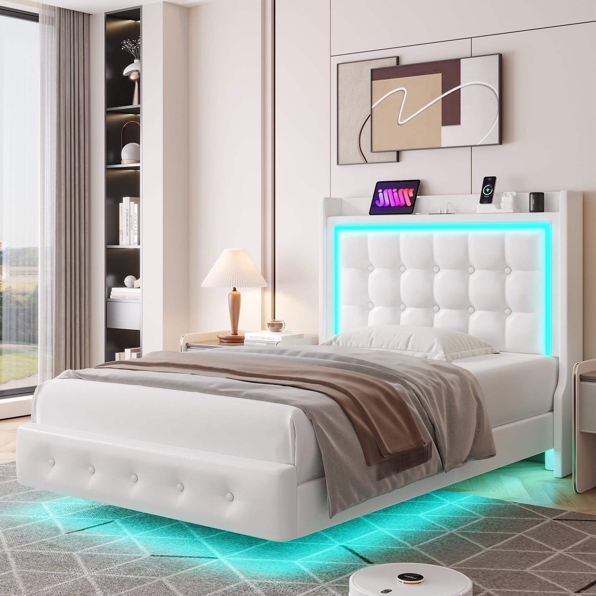 Homfa Twin Size Floating Bed with LED Lights & Charging Station, Modern PU Upholstered Platform Bed Frame Bed with Storage Headboard, White