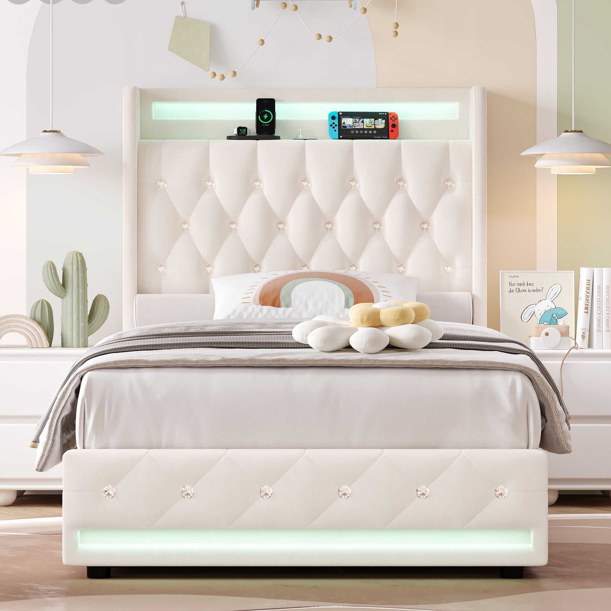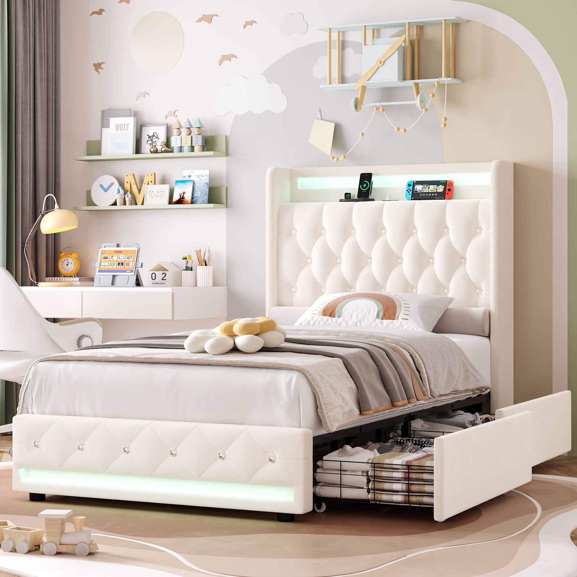 The pink upholstery tiwn size bed frame is also an amazing multifunctional storage bed, which will help your little kids store toys, clothes, blankets, books and anything else in the 4 large hidden drawers on wheels under the bed. On bed frame head, an item display shelf with 4 ports (4 USB+1 Type-C) are even easier to meet your various charging options. With such a versatile premium LED bed frame with storage drawer and charging ports, your convenient and clean bedroom life is close at hand.