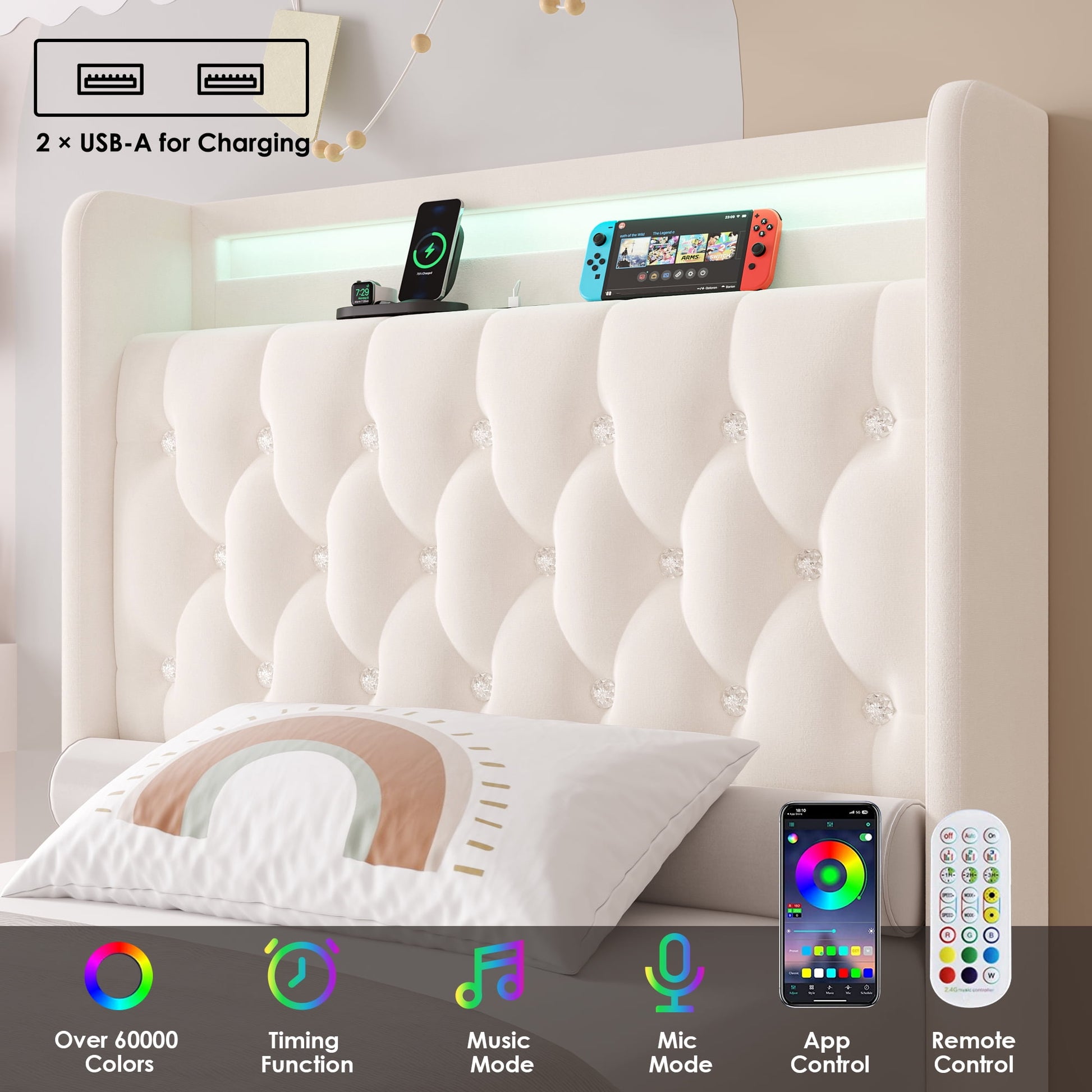- Simple bed frame appearance is decorated with elegant crystal tufted button, which is shining around the LED light at every cozy night.