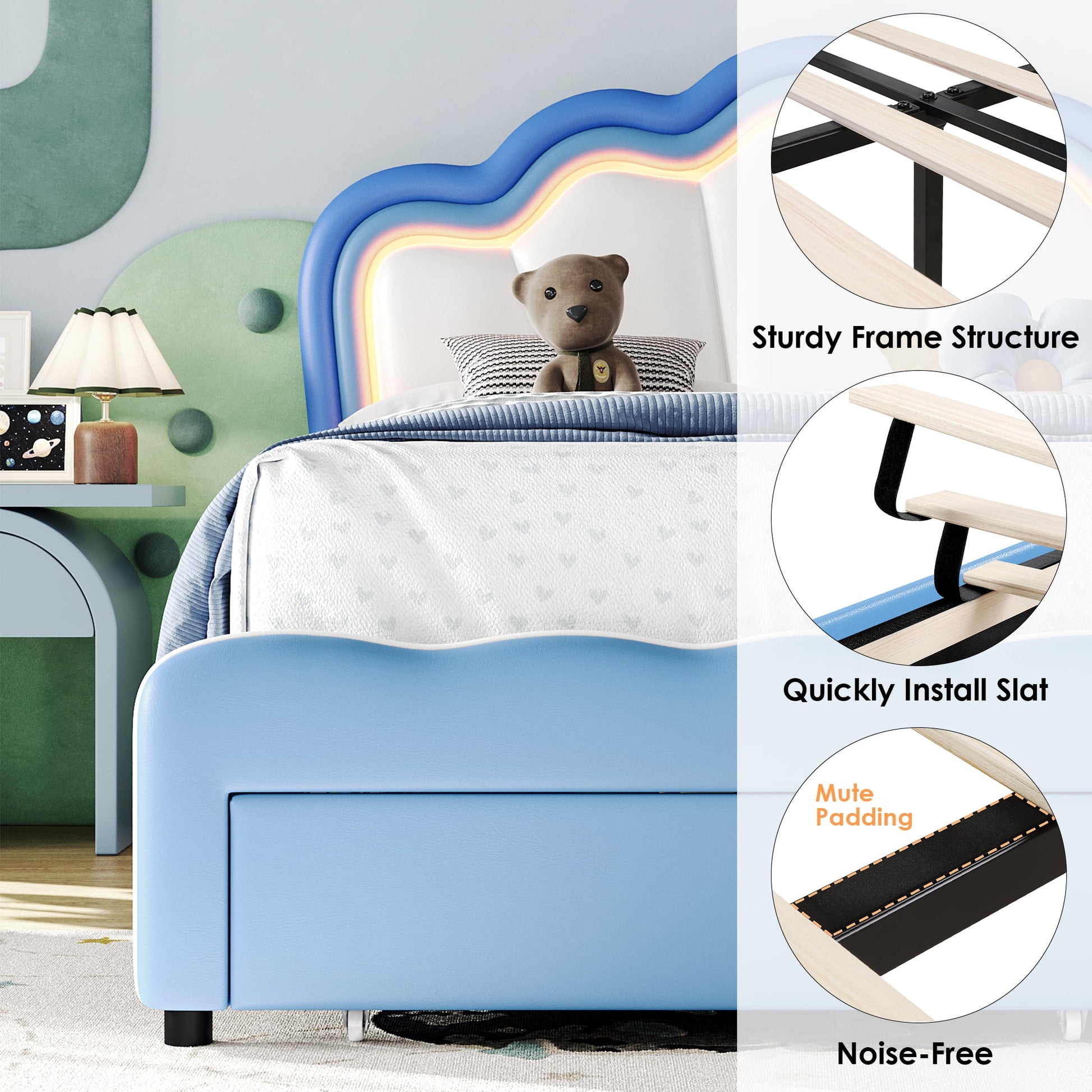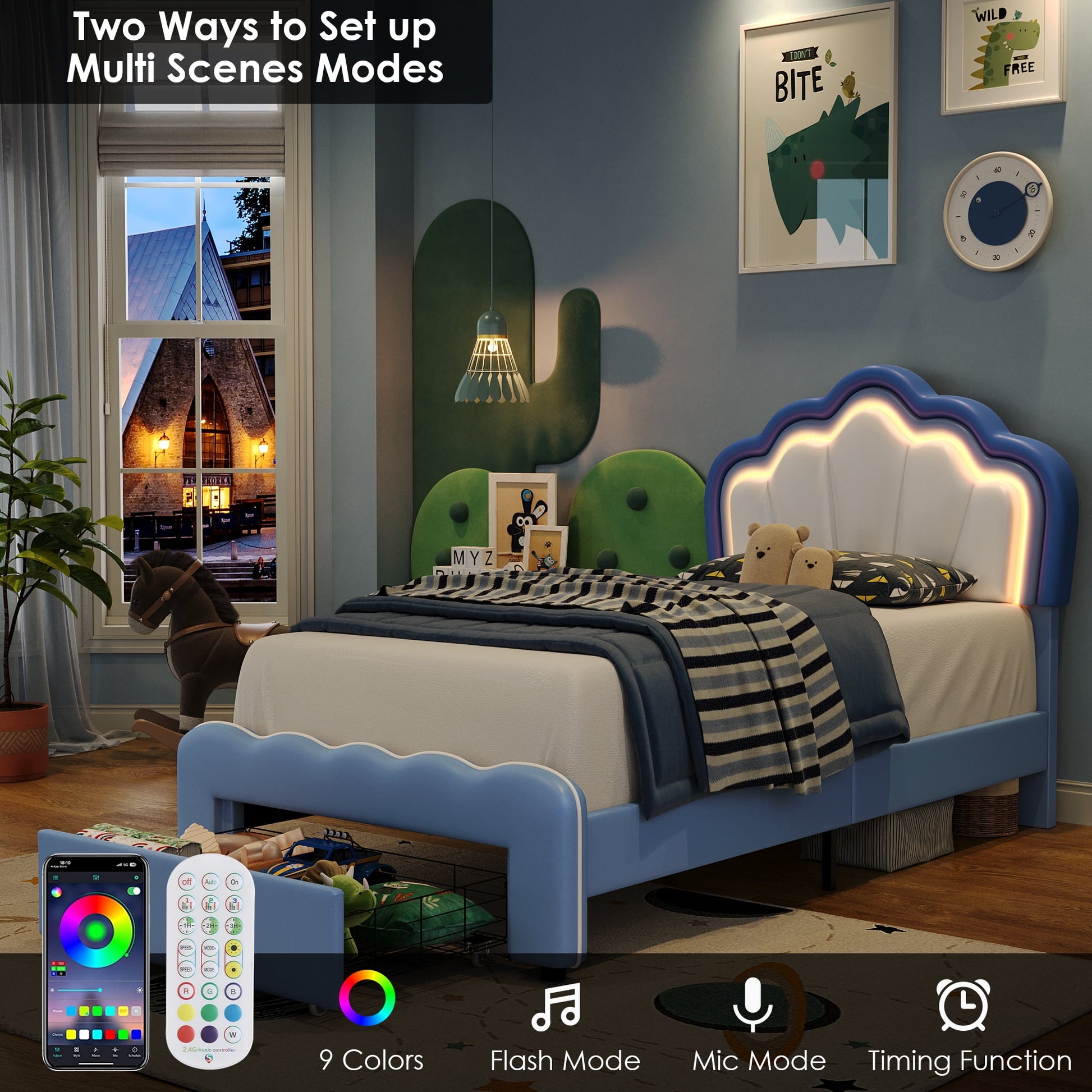 The headboard is equipped with LED light strips with 9 colors, which make the bed frame colorful and create a fascinating atmosphere and stimulate the child's sense of color and imagination. In addition, an underbed storage drawer provides additional storage space in the bedroom. This lovely LED bed frame is definitely the best bedroom gift for your kid!