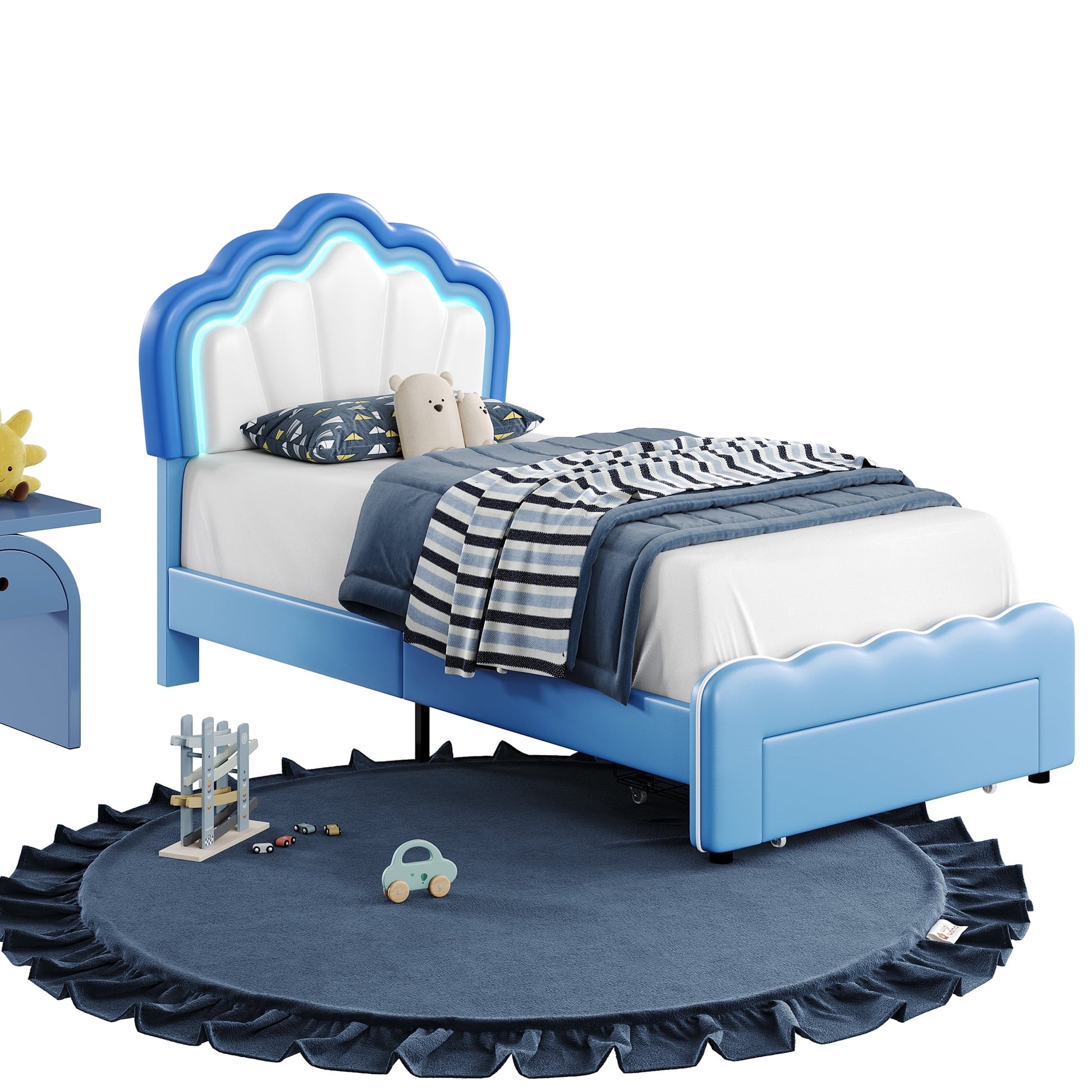Homfa Twin Size LED Bed Frame with Drawer, PU Leather Upholstered Platform Bed with Adjustable Petal Headboard for Kid, Blue