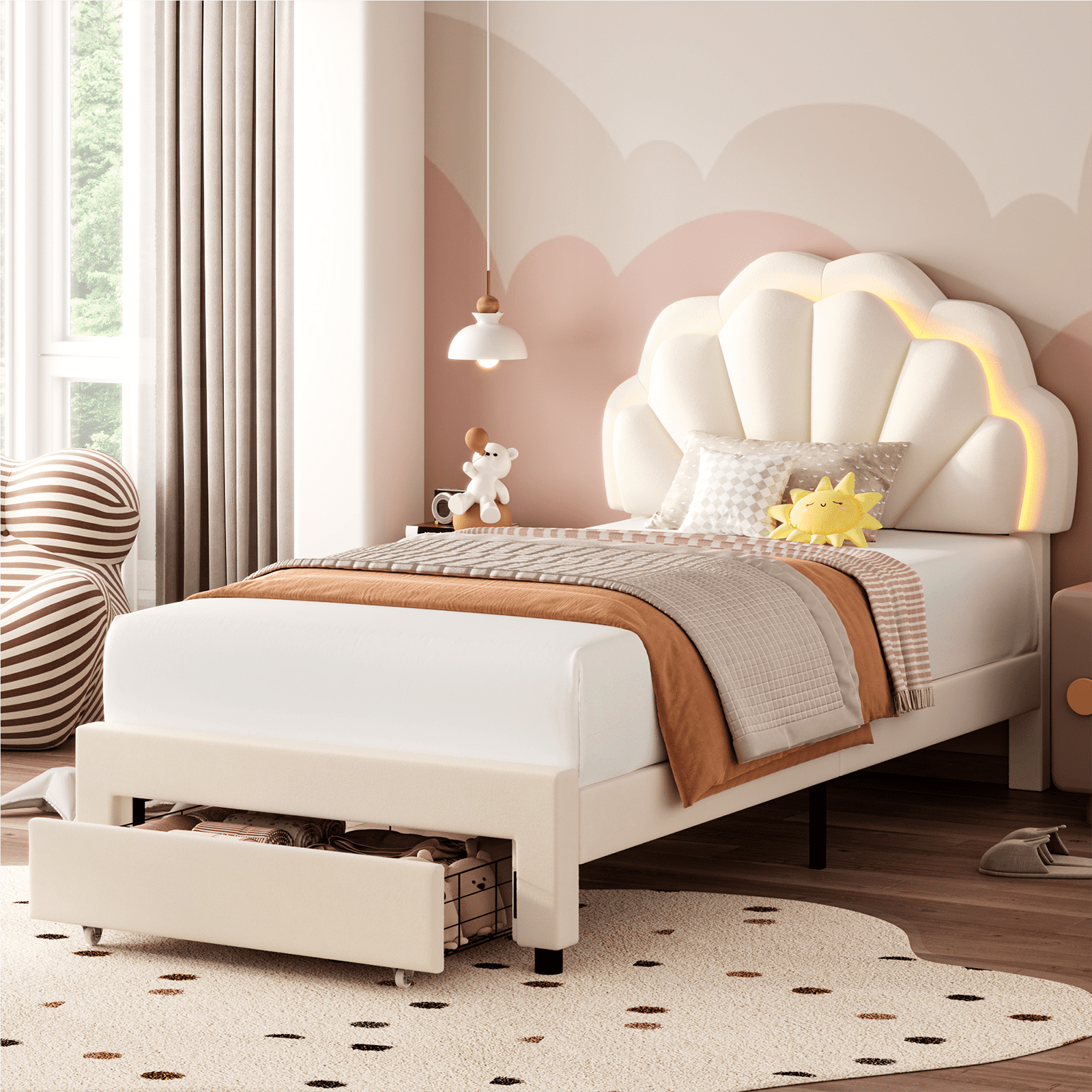 Homfa Twin Size LED Bed Frame with Drawer, Velvet Upholstered Platform Bed with Adjustable Petal Headboard for Kid, Beige