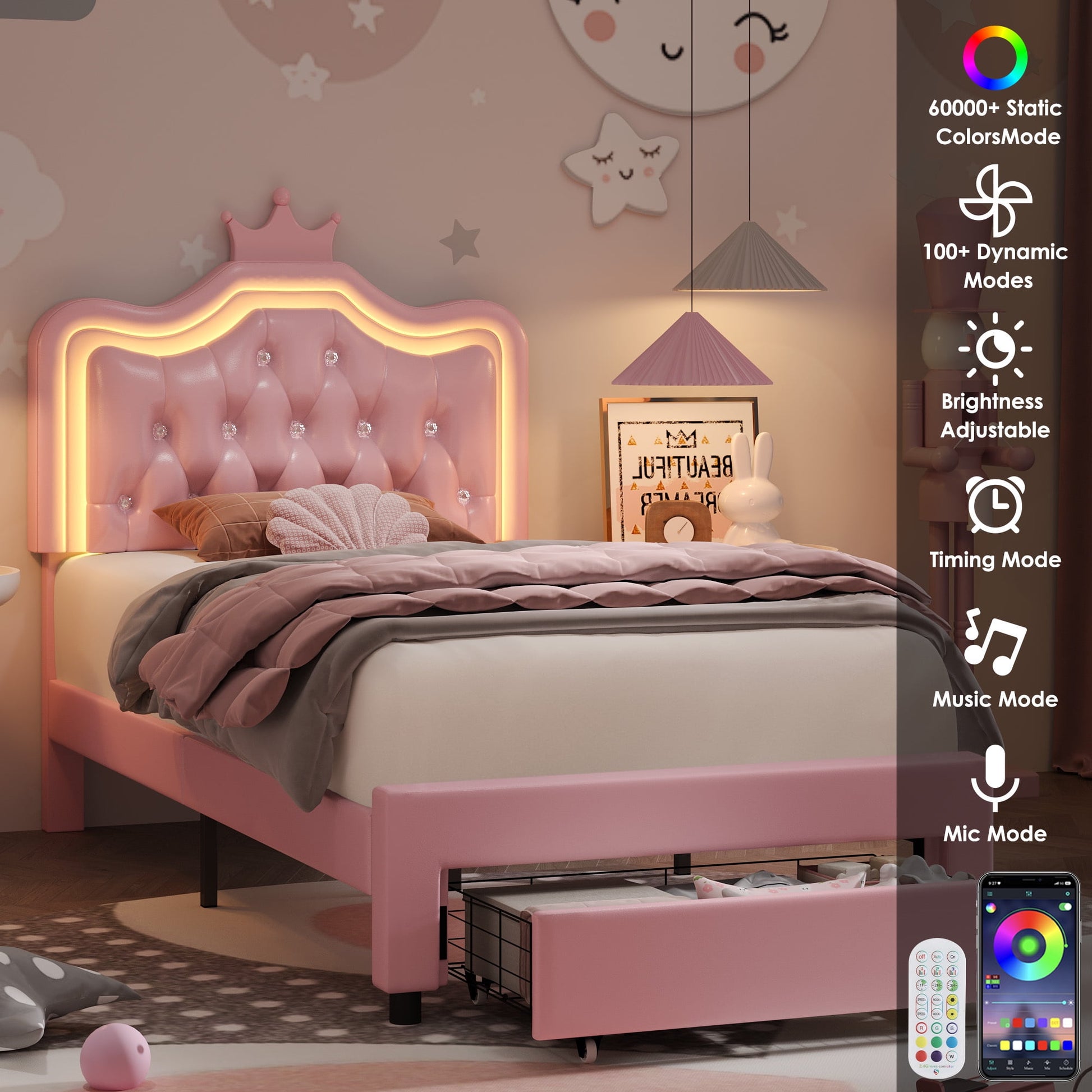 Homfa's twin size LED platform bed is the perfect gift for your kids. With PU leather upholstered headboard with crystal buttons, the cute crown platform bed adds a playful touch and interest to your child's room. One large drawer of the bed end can provide ample and hidden storage for bedroom supplies. The LED platform bed is with 3 music-activated modes, providing a calming and soothing ambiance, perfect for bedtime stories and sweet dreams.