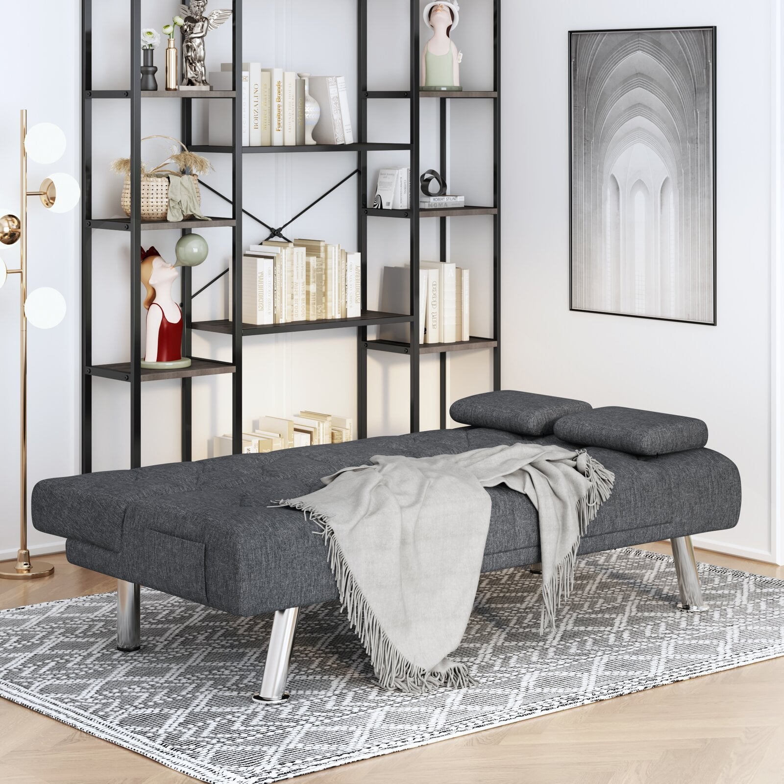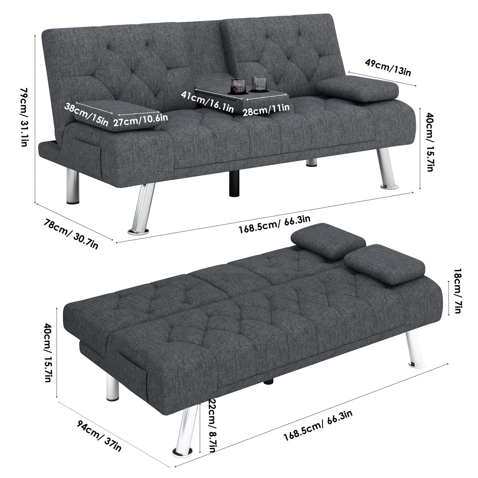 Homfa Upholstered Sofa Bed Couch, Convertible Futon Sleeper Sofa with Removable Armrests, Dark Gray