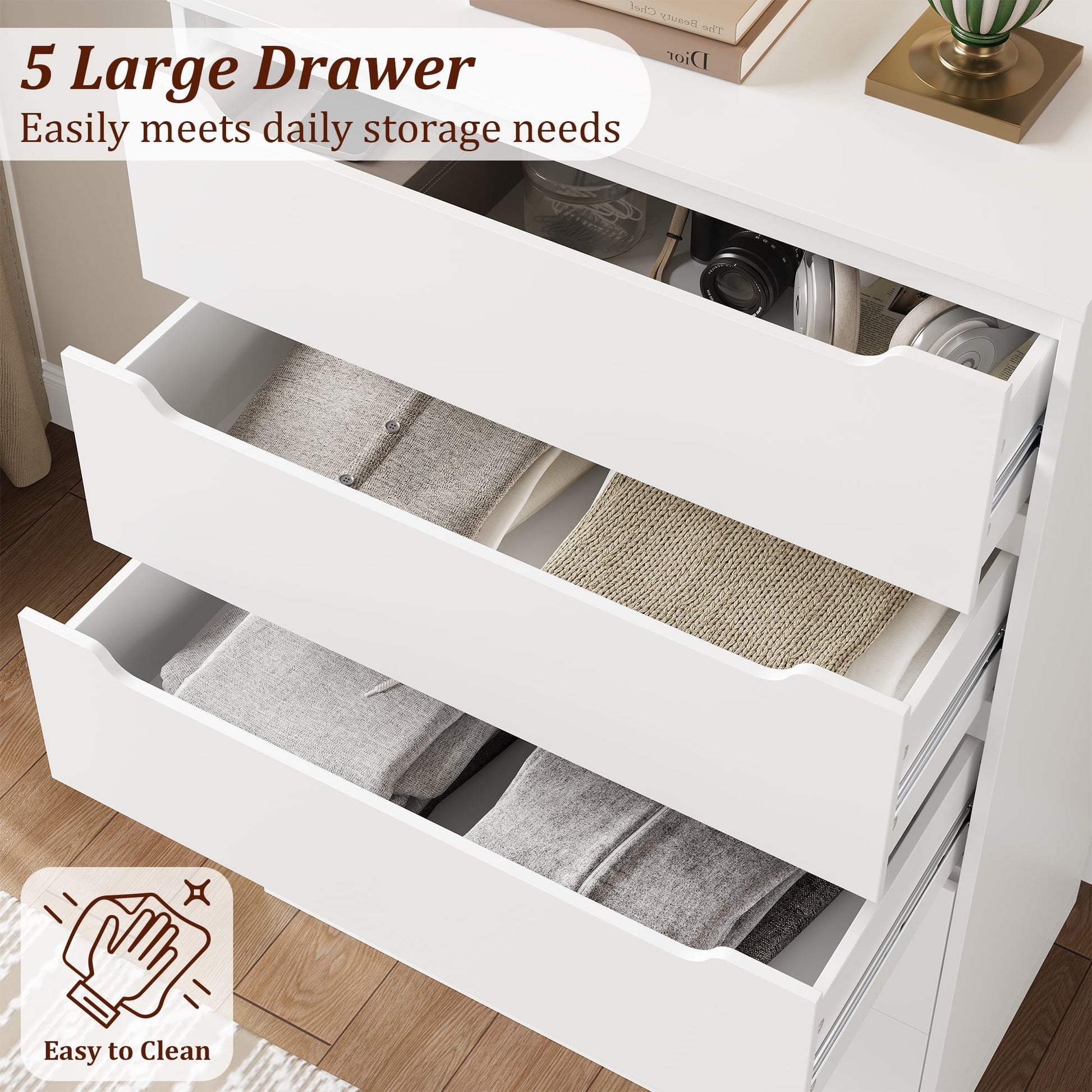 Homfa chest of 5 drawers has spacious drawers that provide plenty of space for storing and categorizing your daily necessities, and the grooved design of the drawers with smooth guides makes it easier for you to pull it open and close it.
