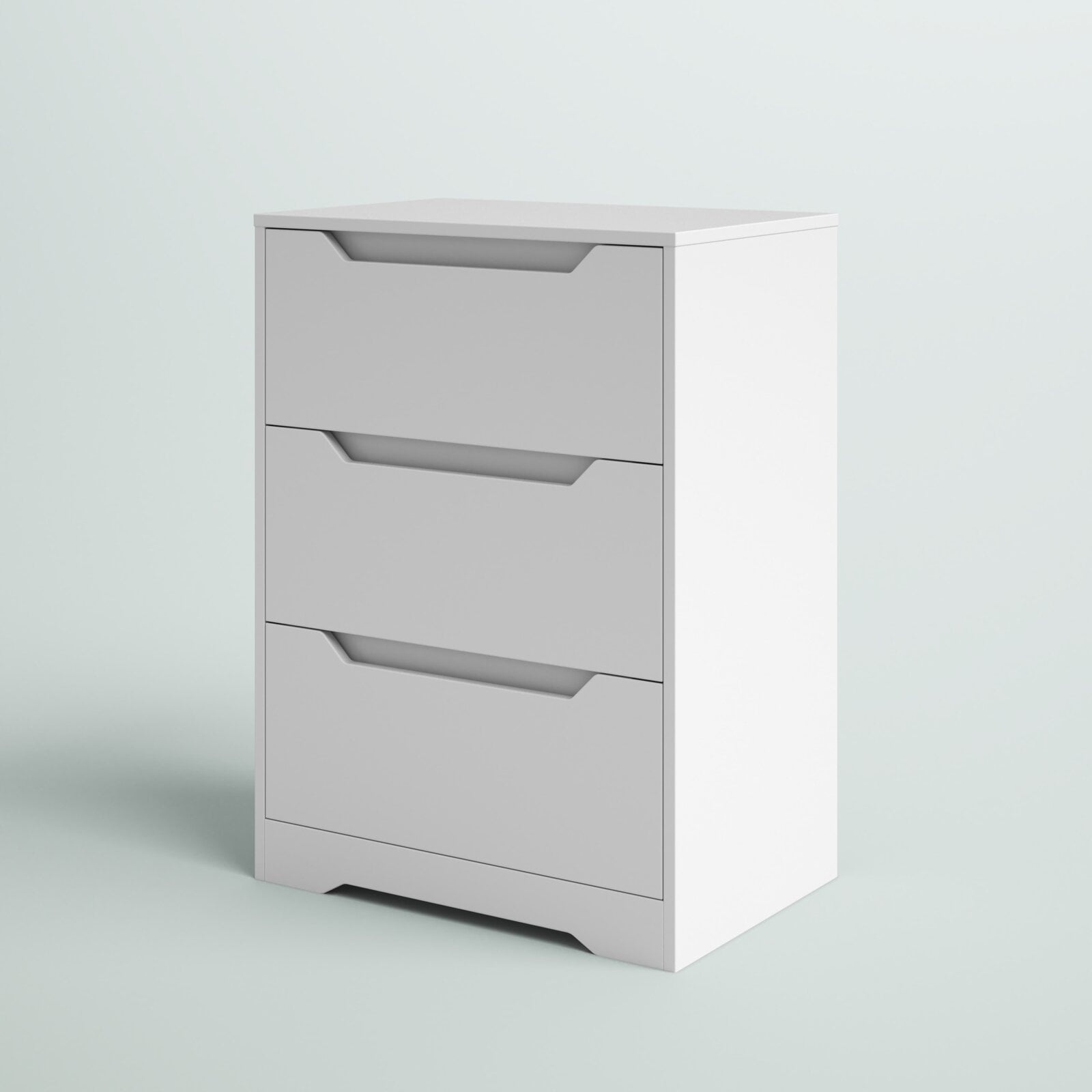 Featuring clean lines and a minimalist flat design, this white chest of drawers easily blends into the decor of any space.Unique cutout handles and an elegant beveled base create a modern, uncluttered look for your room.