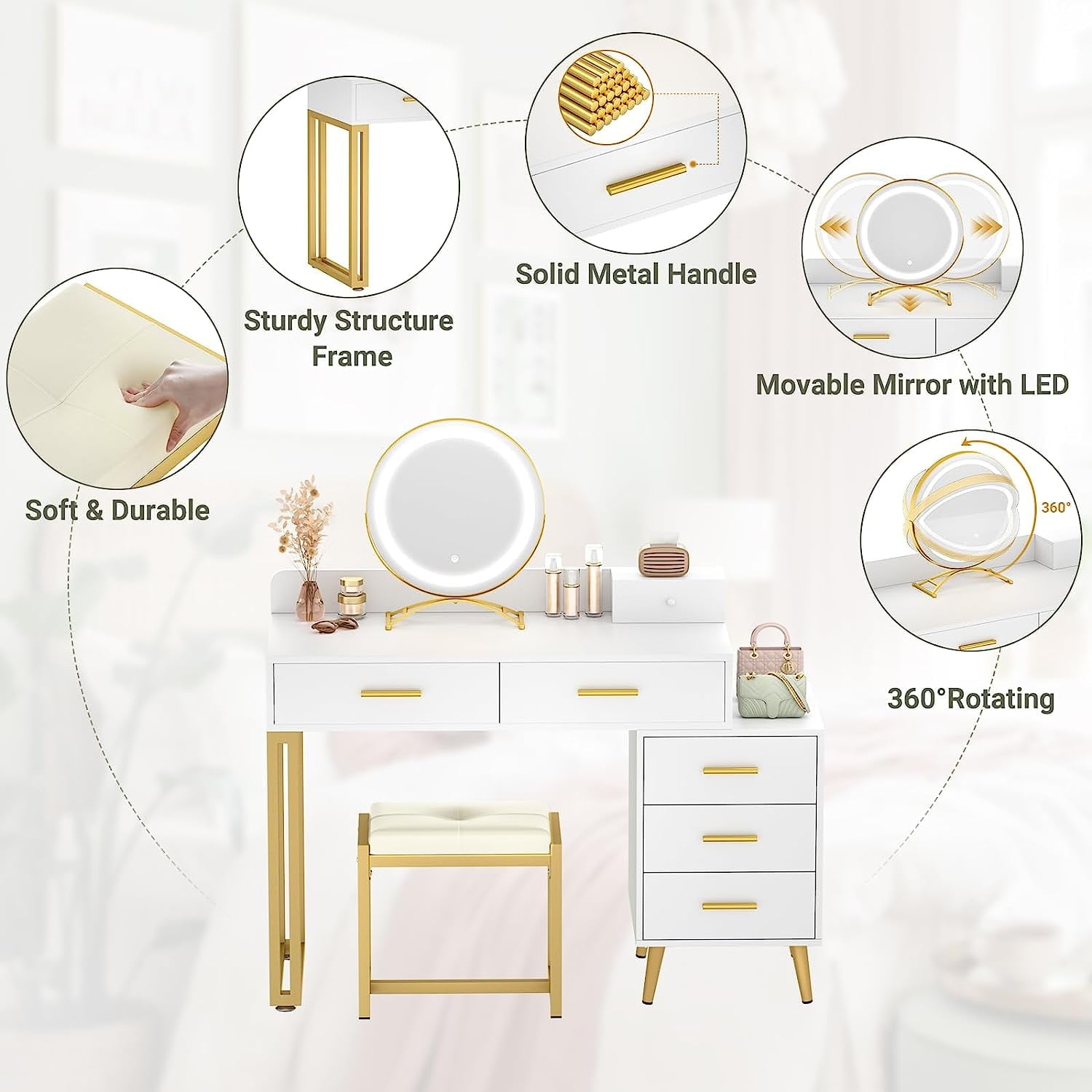 - Multi-functional Dressing Table Set: The make-up table is equipped with matching vanity stool. The beautiful and comfortable stool is made of soft cushion and durable frame, wear-resistant and easy to clean, bring a comfortable experience when you makeup. Solid metal handles have been smoothed, will not scratch, oxidize, deform, or fade.