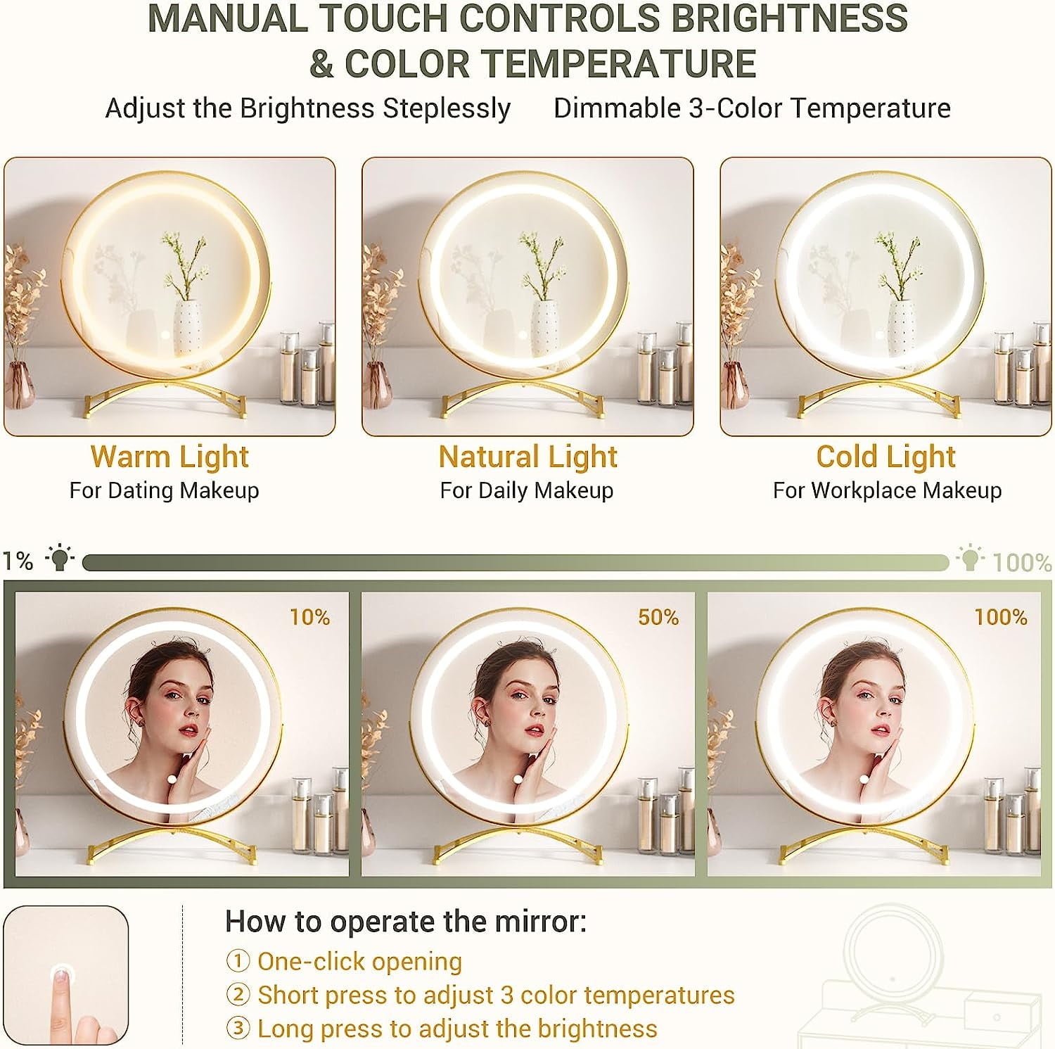 - Vanity Desk with Mirror & 3 Colors Lights: Our black vanity makeup desk provide a round movable mirror with 3 different color settings: warm yellow, natural white and cold white light, soft and not dazzling light source, allowing you to make-up for a long time without hurting your eyes. You can click the button easy to change the color or adjust the brightness steplessly according to different scenes and different makeup. Bring yourself a joyful dressing experience with this makeup vanity.