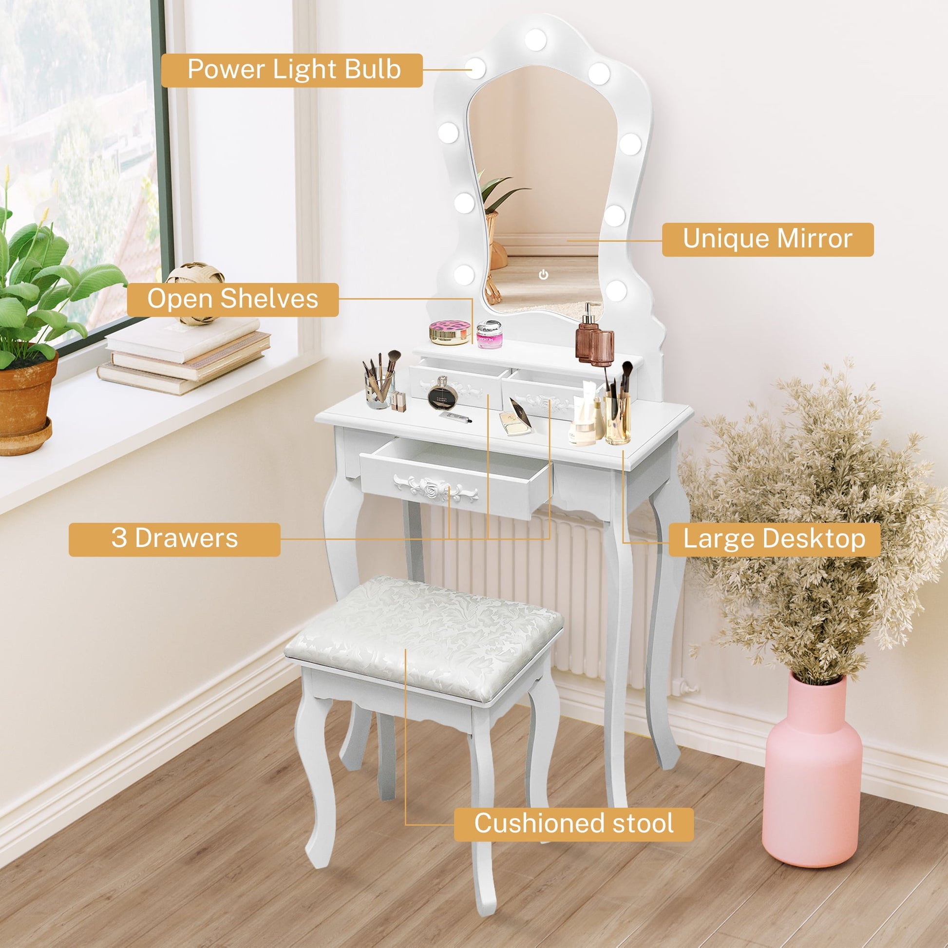 Elevate your makeup routine with our Modern Vanity Table with a Unique 3 Color Lighted Mirror. This stunning piece offers a sleek and sophisticated design, perfect for any contemporary bedroom. It comes with 3 spacious drawers for all your makeup essentials and additional storage shelves for easy organization. The lighted mirror provides ideal illumination, ensuring flawless application every time. The set also includes a comfortable cushioned stool for your convenience. Ideal for girls and women who appreciate beauty and elegance, this Makeup Vanity Desk is more than just a piece of furniture - it's a personal style station that caters to all your makeup needs.