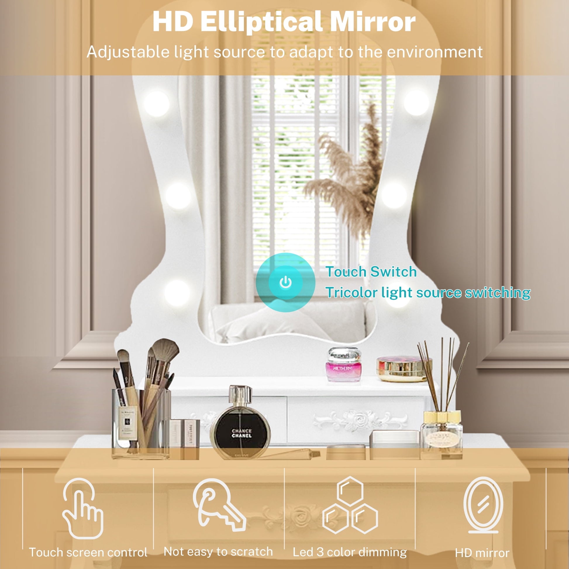 [VANITY SET WITH MIRROR] - The lighted mirror of the vanity with high definition can reflect faces. Just touch the screen switch to turn on the light allowing you to observe your makeup and hairstyle in all directions.