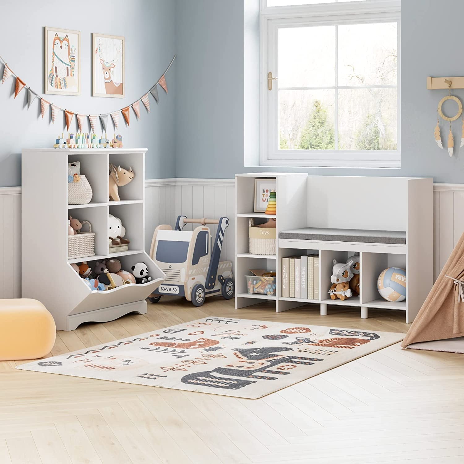 Product Description 6 cubbies for storage Spacious storage inspires kids to create, collect, and curate Large Seat Cushion Large seating space is fantastic for two siblings to share Adjustable Shelf One adjustable shelf provide flexible storage Anti-tip Device Rounded corners and anti-tip device keep kids safe Details Brief content visible, double tap to read full content.Full content visible, double tap to read brief content.