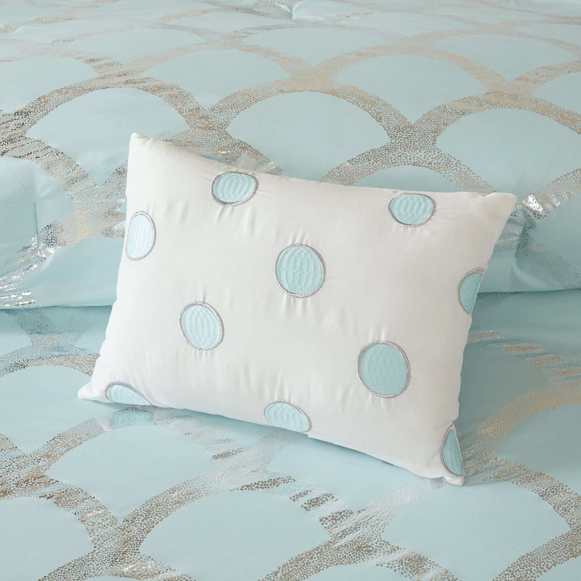 Give your bedroom a modern flair with the Home Essence Apartment Janelle Comforter And Sheet Set. The comforter and 2 shams (1 in Twin/TwinXL) showcases a metallic scallop print on the top of the bed, for striking contemporary look. A solid reverse matches the face of the comforter, while a decorative pillow adds a charming touch. Also included is a complete sheet set that complements the rest of the comforter set. Machine washable, this comforter and sheet set is made from ultra-soft microfiber to provide exceptional comfort for a restful night's sleep. This bedding set uses an antimicrobial treatment that provides built-in freshness protection, reducing the growth of odor causing bacteria to keep fabric lasting longer.