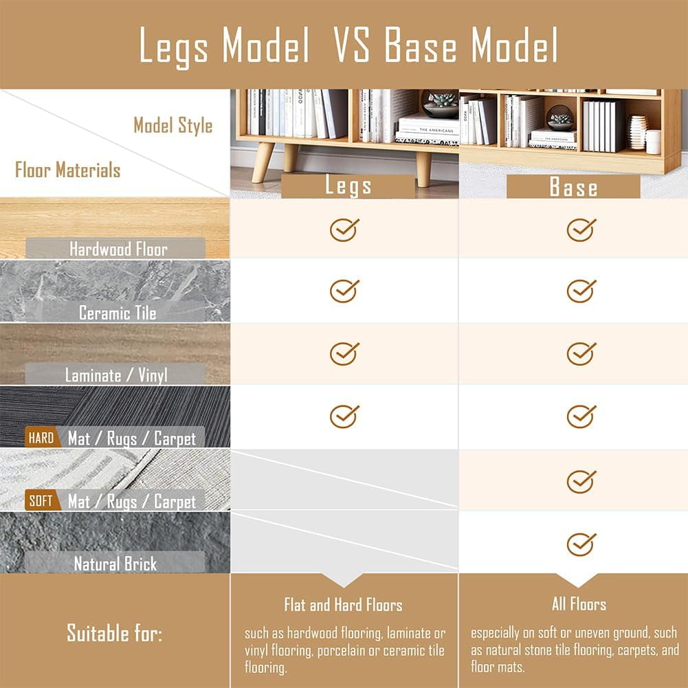This open shelving bookcase has two mount models: the legs model and the base model, suitable for different flooring.