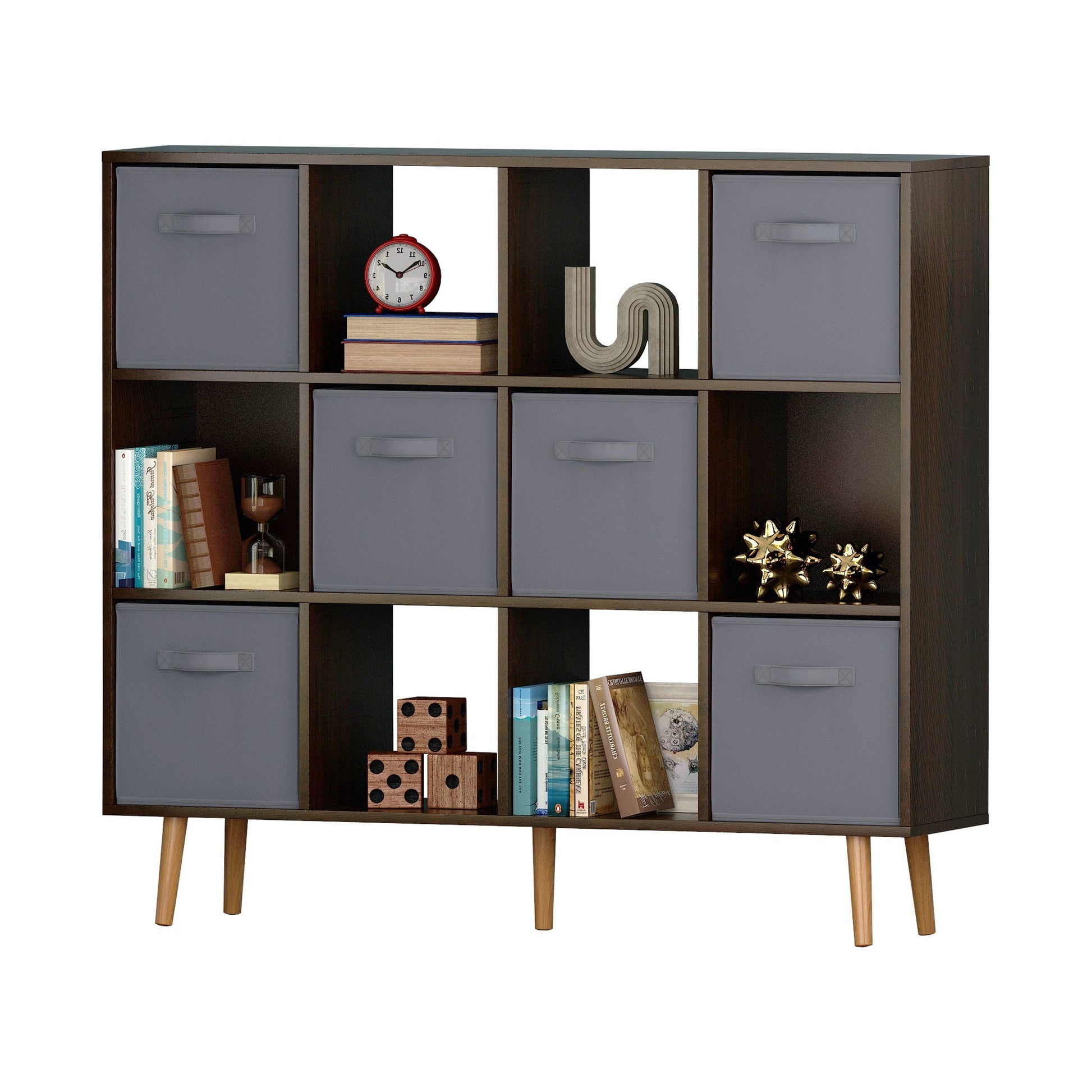 IVV 3 Tier Book Shelf with Fabric Drawers and Wood Legs, Modern Minimalist 12 Cube Open Bookcase Storage Organizer, Freestanding Display Bookcases for Small Space,Bedroom,Living Room (Brown)